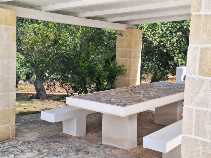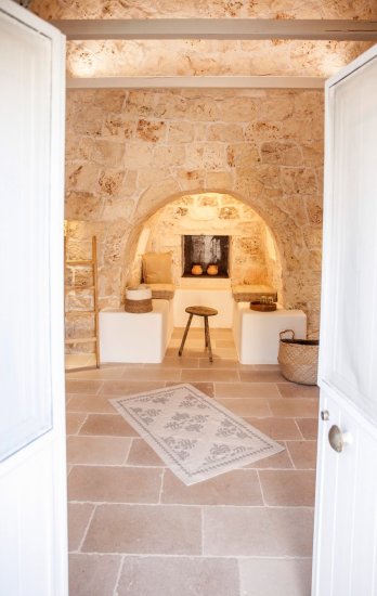Completely renovated in 2023, the property brings together a main villa and an original trullo, both restored through a refined design that enhances local materials and clean lines. Light defines every space: white walls and ceilings amplify the interiors, while Trani natural stone flooring in the trullo and two bedrooms dialogues elegantly with the original Italian cement tiles and ceramics, carefully preserved in the remaining rooms, bathrooms, veranda, and the built-in masonry kitchen.