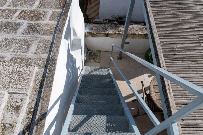 From here, a staircase leads to the upper panoramic terrace, one of the highest and most spectacular in the area, offering sweeping views over Ostuni’s main square, the white rooftops of the historic center, the countryside dotted with centuries-old olive trees, and the sea. A space of remarkable emotional impact, ideal for private moments or to elevate an exclusive hospitality project.