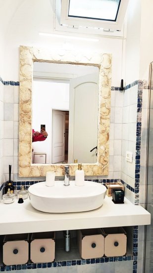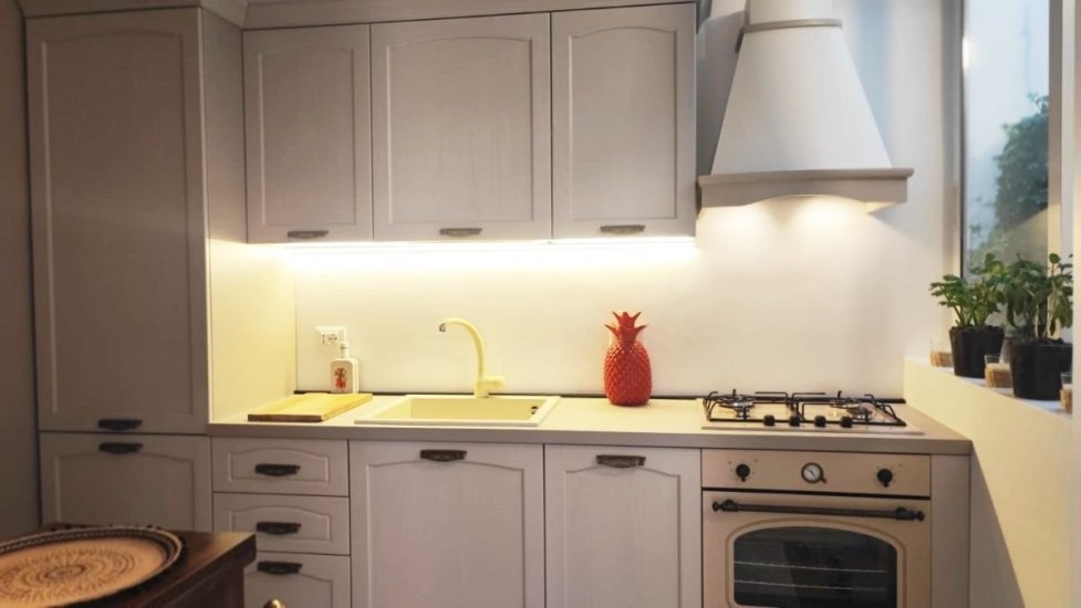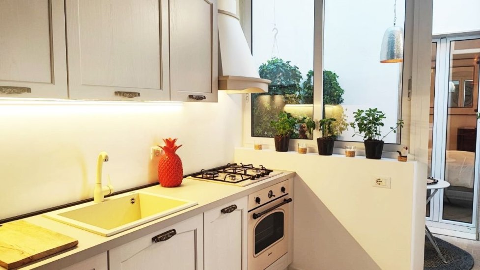 La cucina abitabile, completamente attrezzata e affacciata su uno spazio esterno privato, invita a vivere il ritmo lento della vita pugliese: colazioni all’aperto, cene sotto le stelle, momenti di silenzio e contemplazione tra i profumi delle erbe aromatiche. Un’estensione naturale della casa, ideale per chi ama il connubio tra interno ed esterno.