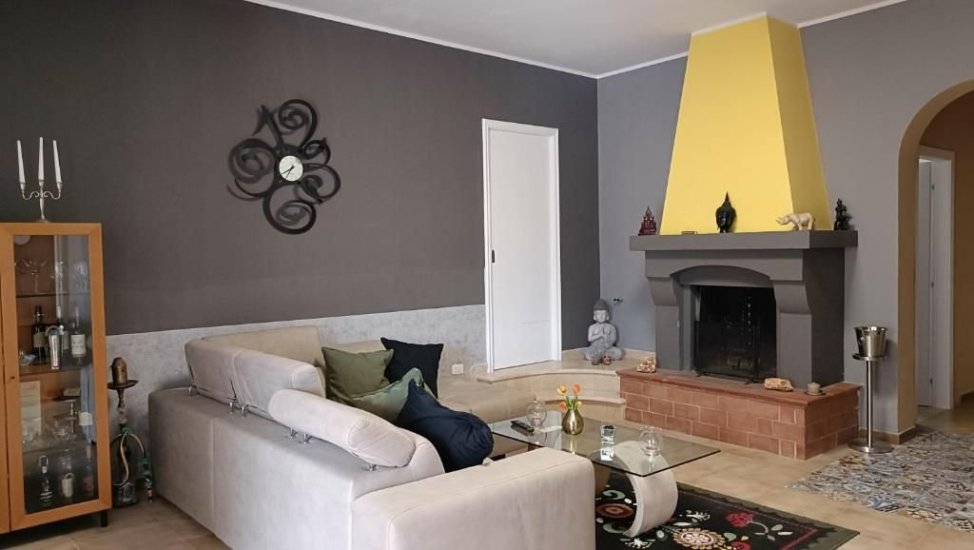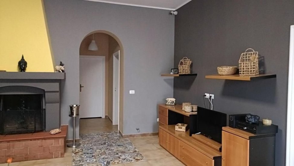 All’interno, il cuore della villa è un ampio soggiorno, dove la luce naturale filtra generosa dalle finestre e accende la pietra chiara delle pareti. Un maestoso caminetto in muratura domina la zona living, creando un’atmosfera calda e accogliente nelle stagioni più fresche. La cucina, ampia e funzionale, si apre verso l’esterno, invitando a colazioni lente e pranzi sotto il pergolato. La zona notte è composta da tre camere da letto luminose, perfettamente distribuite, e un bagno elegante, rifinito con materiali naturali e dettagli artigianali.