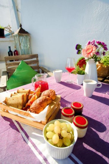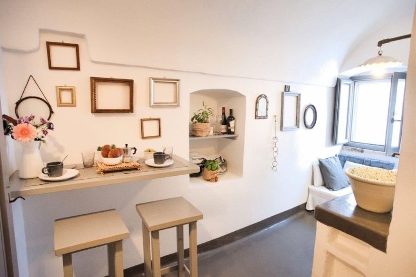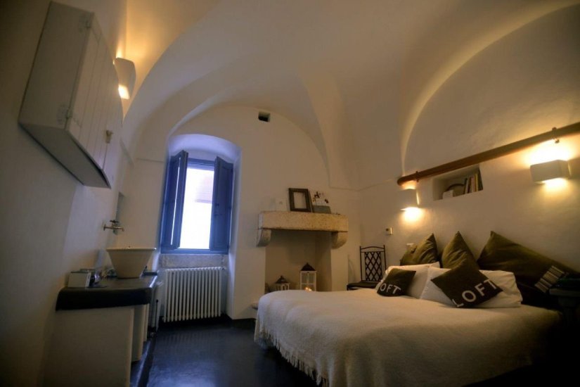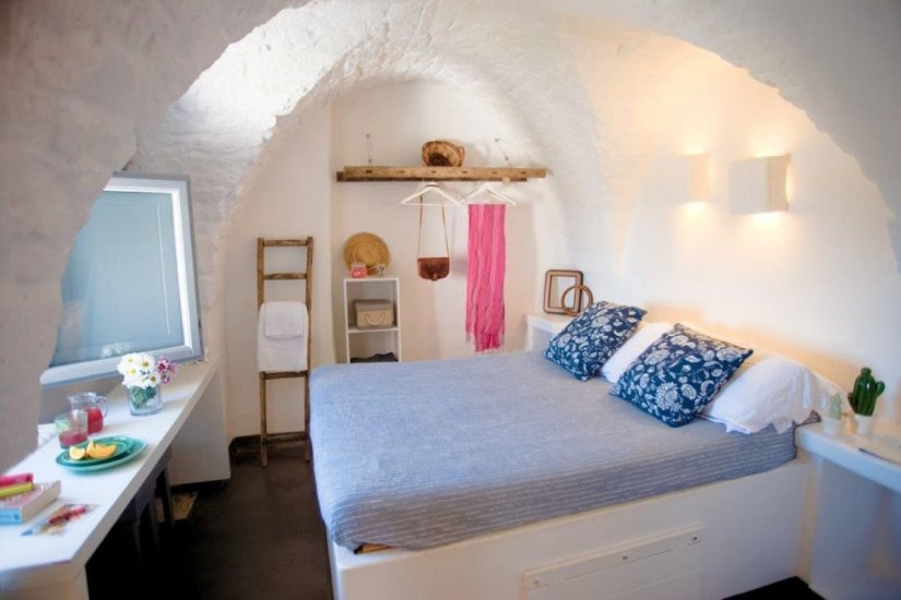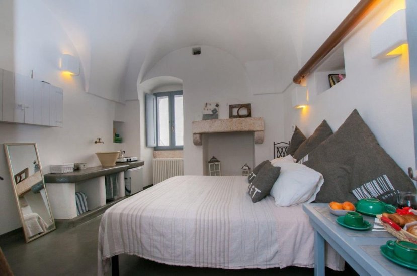 La terza dimora è un vero nido sospeso nella luce di Ostuni. Si raggiunge salendo una rampa di scale che conduce in uno spazio poetico, rivestito di calce bianca, con volte a botte e una finestra che incornicia il cielo come un dipinto d’autore. Un letto alla francese in muratura, angolo cottura con minifrigo, bagno con doccia a vista e libreria: ogni elemento è pensato per creare armonia tra tradizione e intimità.