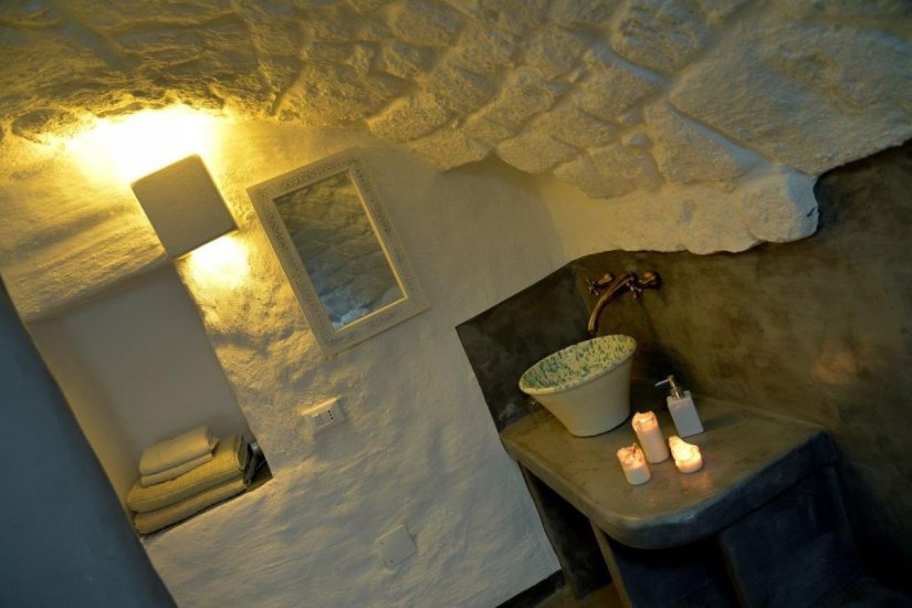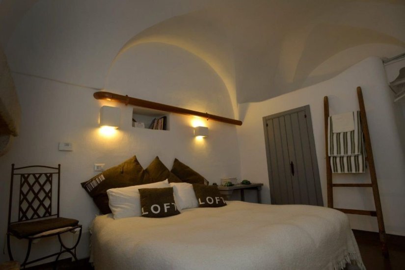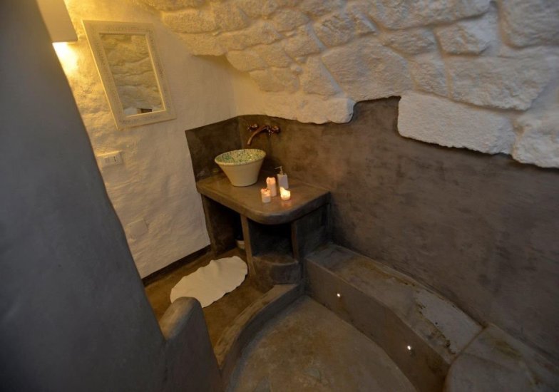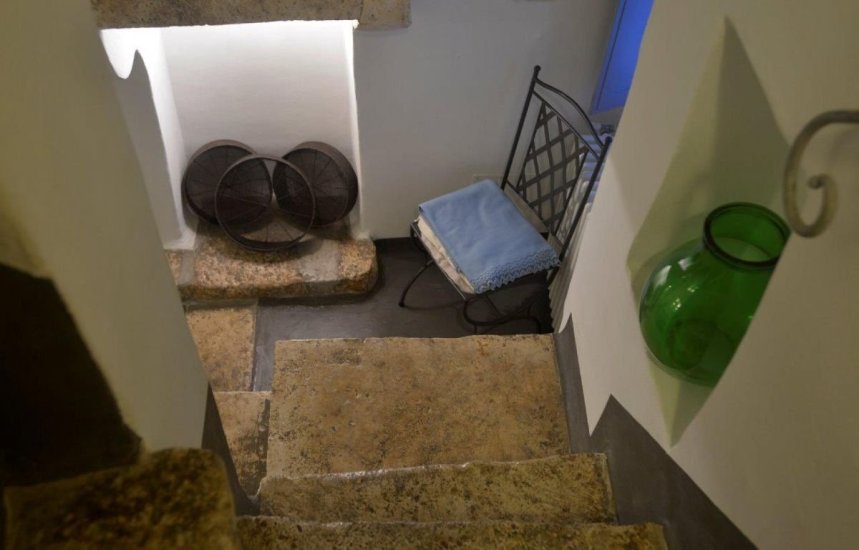 Infine, la quarta perla: un monolocale deluxe con terrazza privata, distribuito su più livelli, dove ogni rampa di scale svela un nuovo incanto. La zona notte è un piccolo gioiello con letto in muratura alla francese, camino, angolo lettura e nicchia-armadio. Salendo, si accede a un secondo livello con bagno, doccia a cascata, angolo cottura e poltrona letto. Ma è solo l’inizio: un’ultima, suggestiva strettoia conduce al terrazzo segreto, un luogo sospeso tra cielo e terra, affacciato da un lato sul dedalo bianco di Ostuni e dall’altro su un mare di ulivi secolari che degrada fino all’Adriatico.