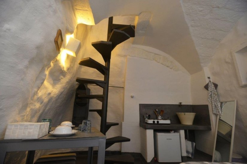 Ogni dimora è una piccola opera d’arte incastonata nella pietra viva, con dettagli originali restaurati, volte a botte, camini in pietra, scale elicoidali, soppalchi in legno, e una terrazza panoramica che toglie il fiato.
