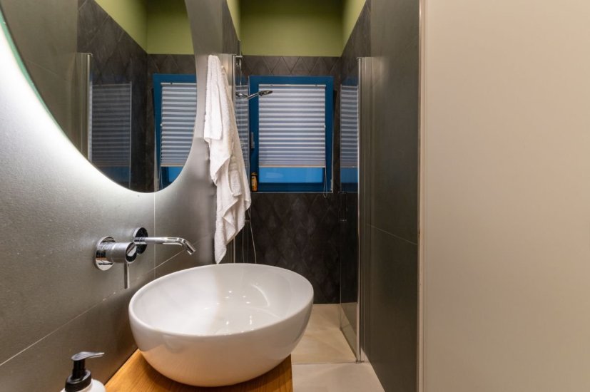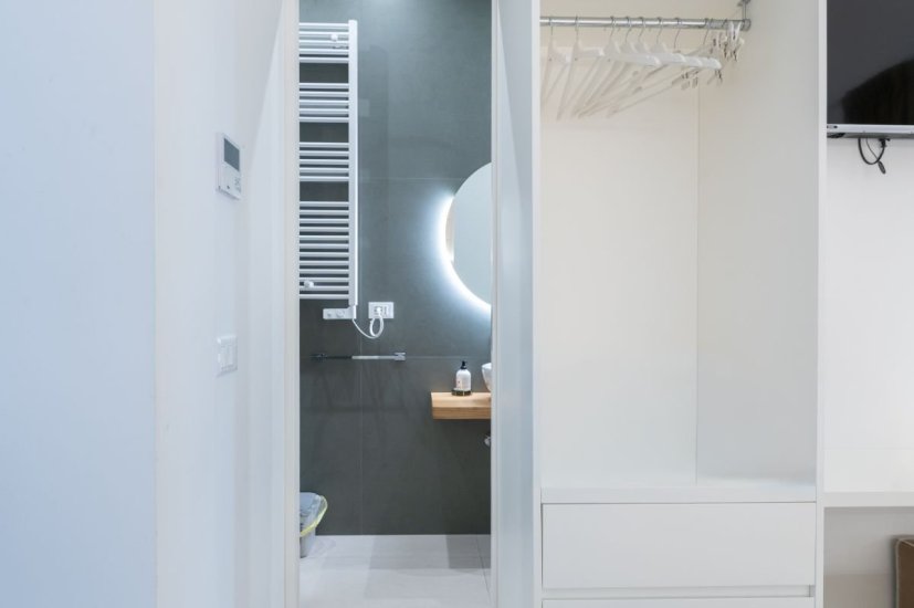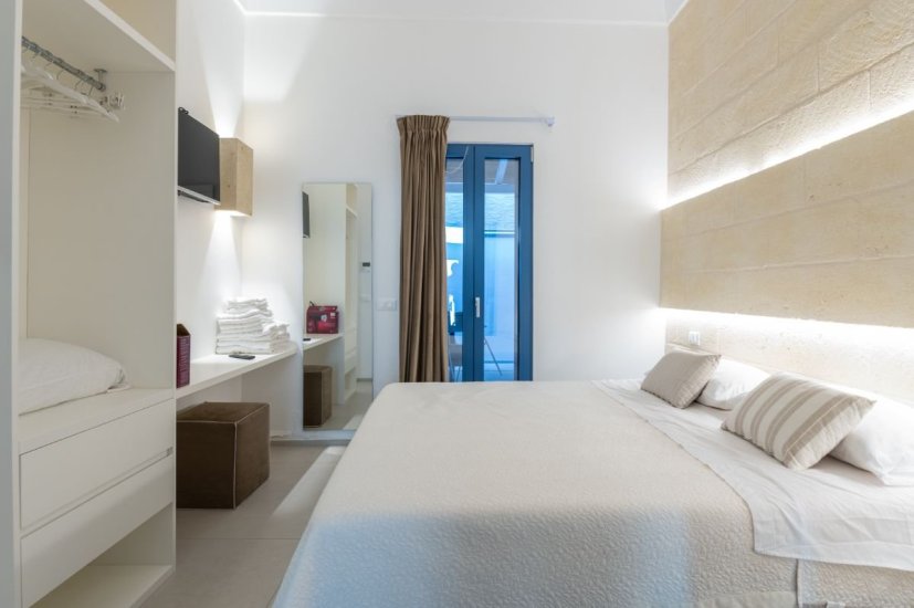 La camera da letto matrimoniale, concepita come una piccola suite, è un’oasi privata con bagno ensuite, aria condizionata, Wi-Fi, armadio e accesso diretto a un terrazzino che cattura la brezza del mattino e il profumo salmastro del mare. Il bagno, sobrio e moderno, offre wc, bidet, lavandino e doccia in un equilibrio armonioso tra funzionalità e stile.