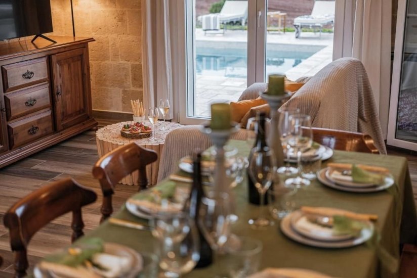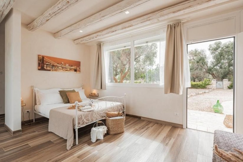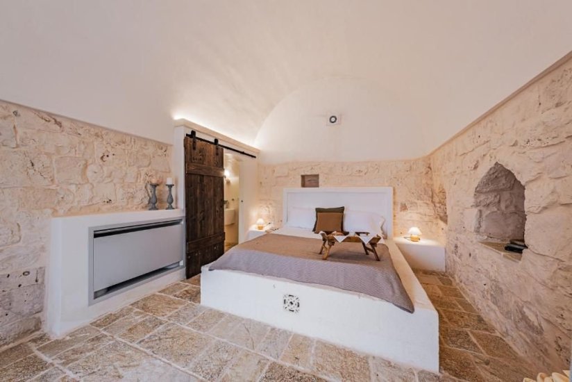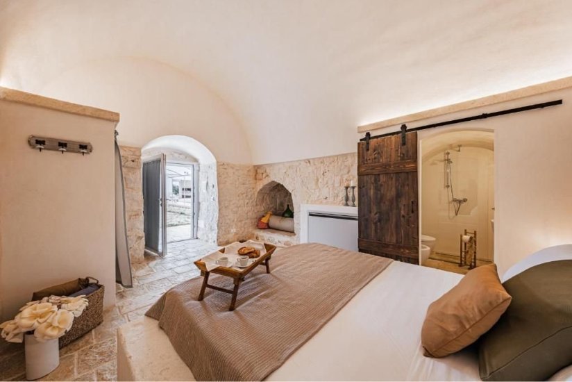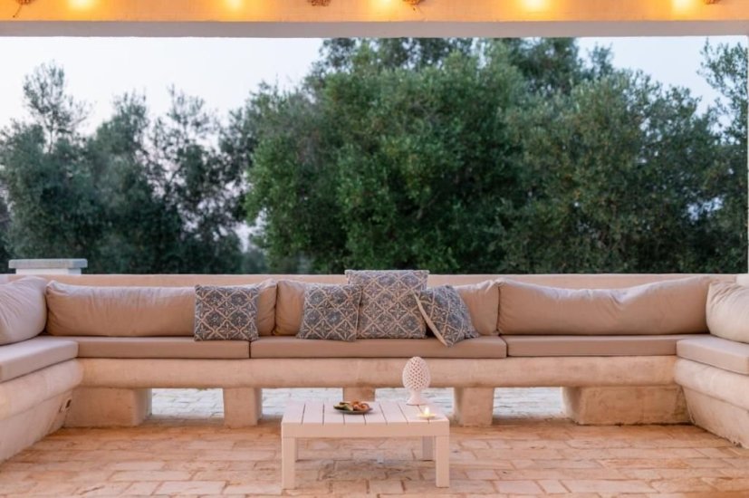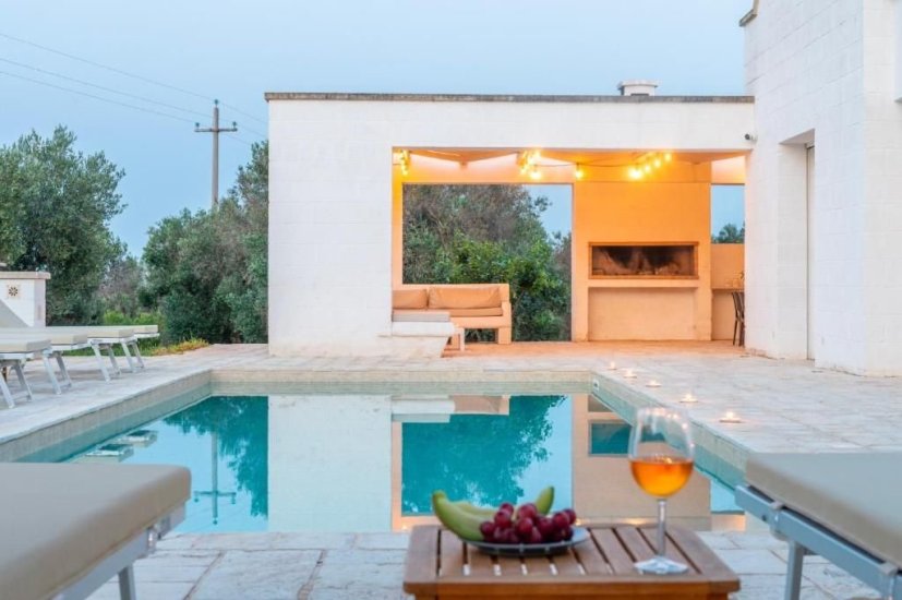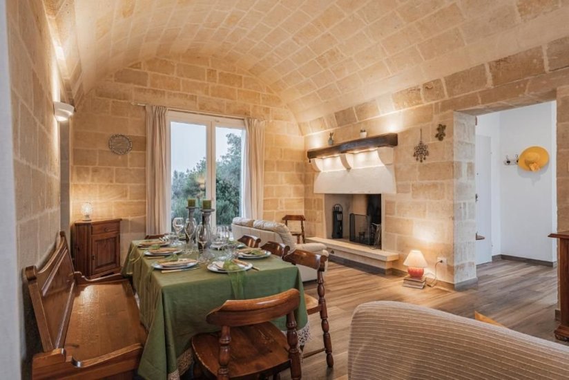 All’esterno, un microcosmo mediterraneo prende forma tra alberi da frutto, un curato limoneto, un piccolo orto biologico e gli iconici muretti a secco che custodiscono l’intera tenuta. La piscina, con il suo solarium in pietra chiara, è un invito costante a contemplare il paesaggio e la sua quiete. Un grande patio coperto si apre sulla campagna e diventa un perfetto palcoscenico per pranzi ombreggiati o cene illuminate dall’oro del tramonto. La cucina esterna, completa di forno a legna, barbecue e piano cottura, trasforma ogni serata in un’esperienza gastronomica autentica, degna della migliore tradizione pugliese.