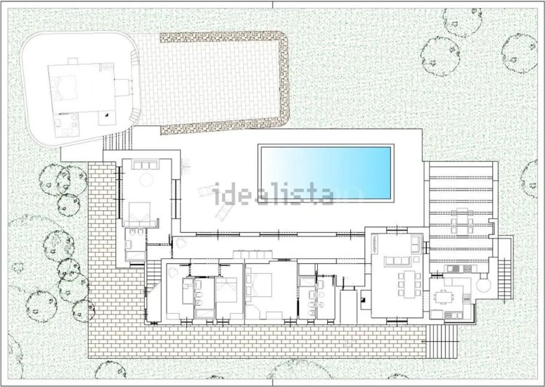 La villa si sviluppa con naturalezza all’interno di un paesaggio privato dove la luce è protagonista. L’abitazione principale ospita quattro camere da letto e tre bagni, una cucina attrezzata pensata per chi ama vivere la convivialità e un luminoso soggiorno con camino che comunica con una sala da pranzo immersa nelle trasparenze del giardino. Gli spazi scorrono fluidi verso l’esterno, dove la grande vetrata invita a raggiungere la scenografica piscina privata (10x4 m, profondità 1,5 m), epicentro del relax estivo. Accanto alla struttura principale, una raffinata dependance in pietra accoglie una quinta camera matrimoniale con bagno privato, perfetta per chi desidera discrezione e indipendenza. In totale, la residenza offre 5 camere e 4 bagni, rendendola ideale sia come dimora privata sia come struttura ricettiva di charme.