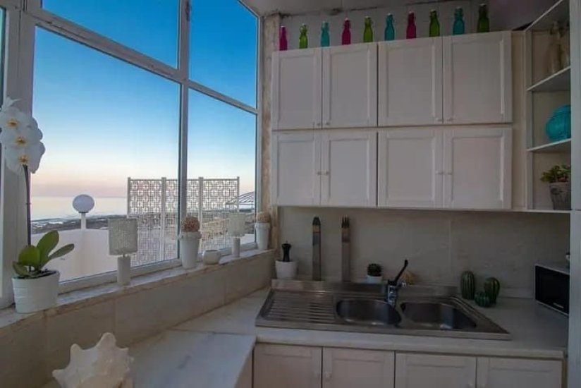L’abitazione si sviluppa su 580 mq interni distribuiti su due livelli, dove gli spazi respirano grazie a grandi superfici vetrate che incorniciano l’azzurro e lasciano entrare il ritmo naturale delle onde. Il piano principale accoglie tre camere da letto e un’ampia zona giorno scenografica, pensata per mettere al centro il mare in ogni momento della giornata. La cucina panoramica in vetro, sospesa come un ponte trasparente, regala al vivere quotidiano un privilegio raro: cucinare con il mare di fronte, come se si fosse a bordo di uno yacht privato.