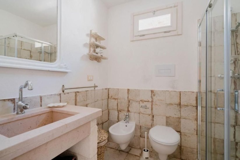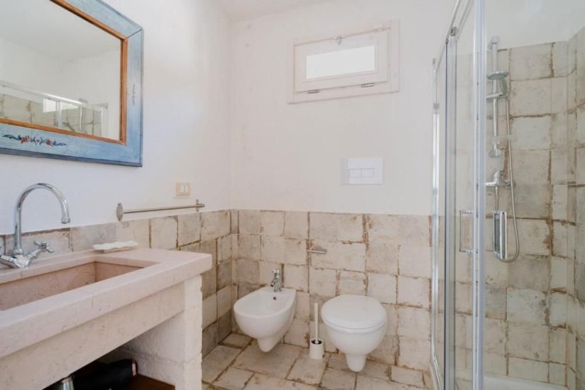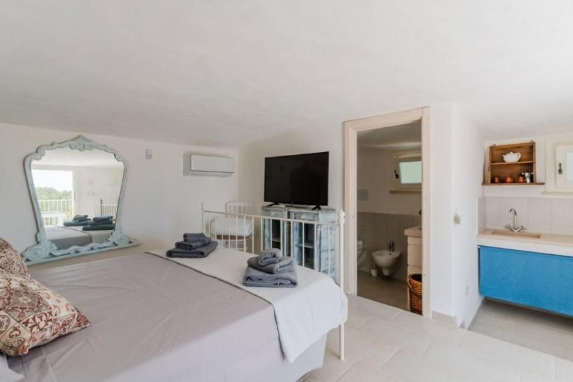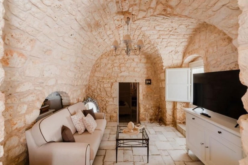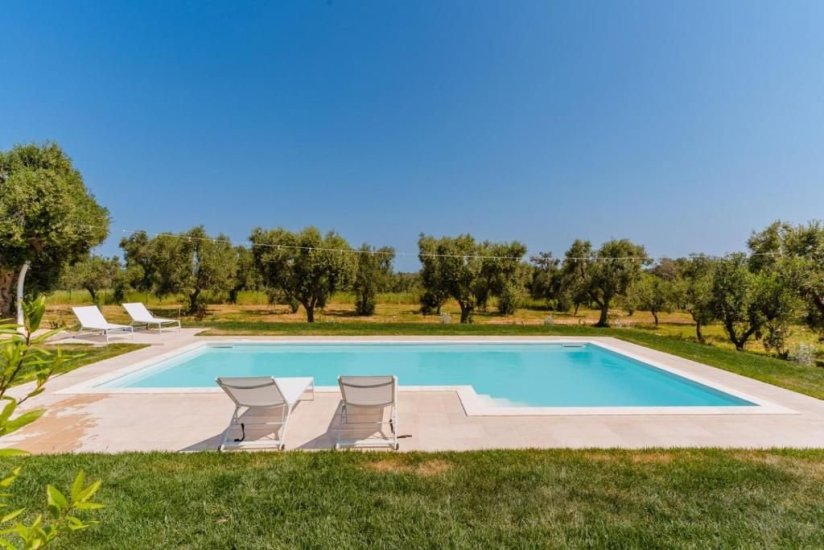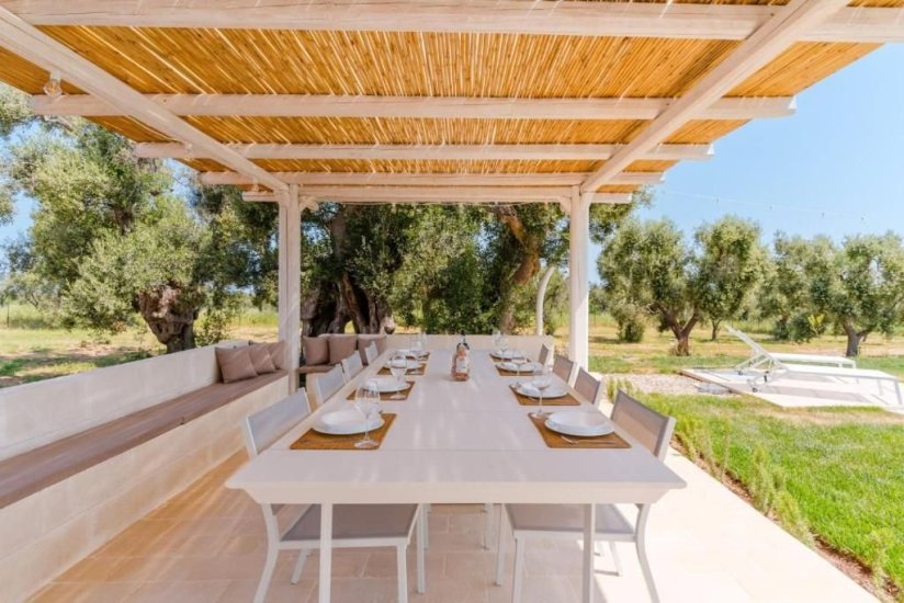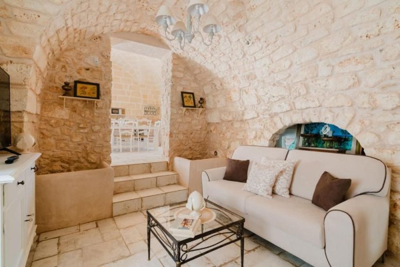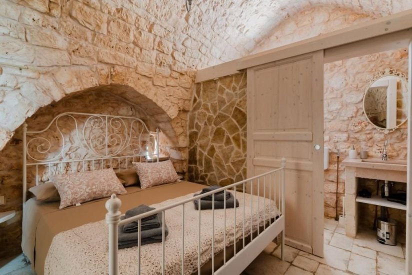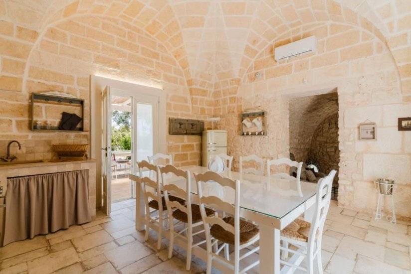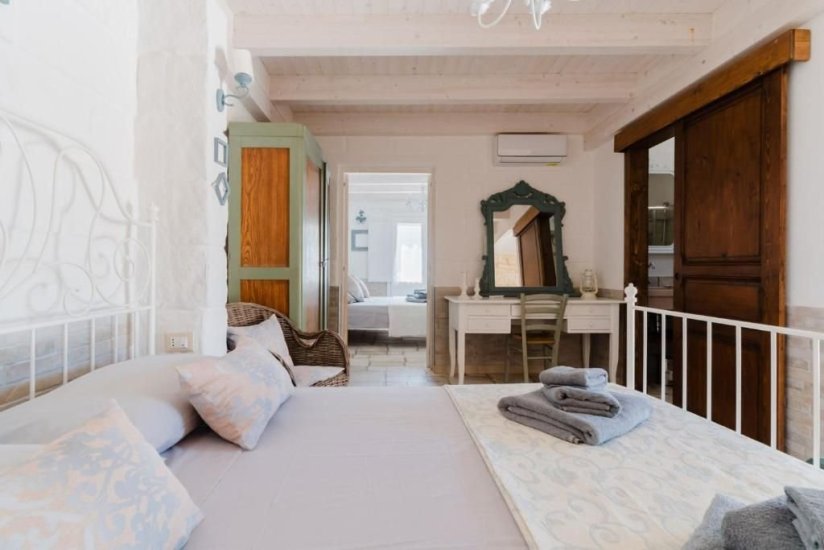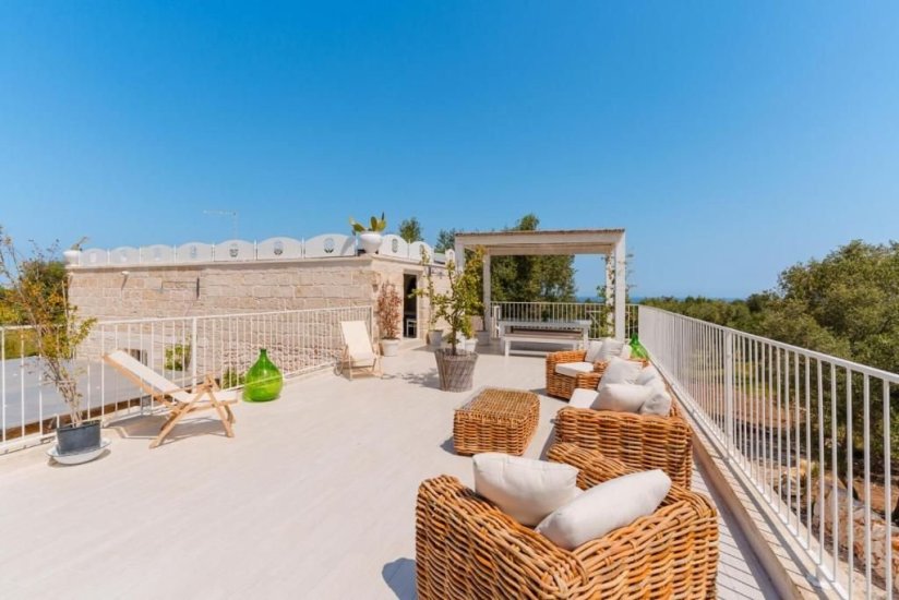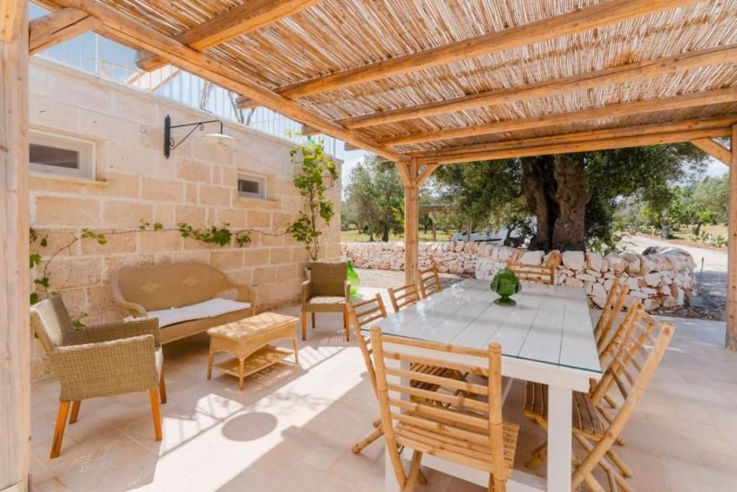 La dimora, elegante e senza tempo, nasce dalla meticolosa ristrutturazione di un antico casolare in pietra locale, preservando con cura le storiche volte a stella, le superfici materiche e le atmosfere tipiche dell’architettura rurale pugliese. Il corpo principale accoglie gli ospiti con un ampio soggiorno dallo stile pulito e sofisticato, cucina a vista integrata nella zona pranzo, un salotto avvolgente e una camera matrimoniale con bagno en suite che coniuga intimità ed estetica. Attigue alla struttura principale sorgono la dependance, con due camere matrimoniali dotate di bagno privato, e una suite al piano superiore che regala un’esperienza esclusiva: un ambiente raffinato con bagno privato e terrazza panoramica arredata, un vero palcoscenico sulla campagna e sul mare, da cui si possono ammirare albe e tramonti che sembrano scolpiti nel cielo.