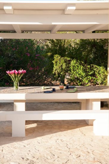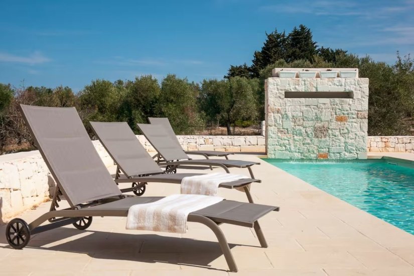 All’esterno, la tenuta rivela tutta la sua anima scenografica. La piscina di circa 40 mq, realizzata ex novo nel 2023, sembra fondersi con l’orizzonte marino grazie alla posizione dominante; la cascata e la illuminazione notturna trasformano l’area piscina in un’esperienza sensoriale, dal giorno alla sera. Le pietre locali, provenienti dalle cave vicine, rivestono terrazze, solarium e bordi piscina, creando continuità con il paesaggio. Una cucina esterna con barbecue completa l’outdoor living, pensato per vivere la casa tutto l’anno.