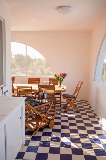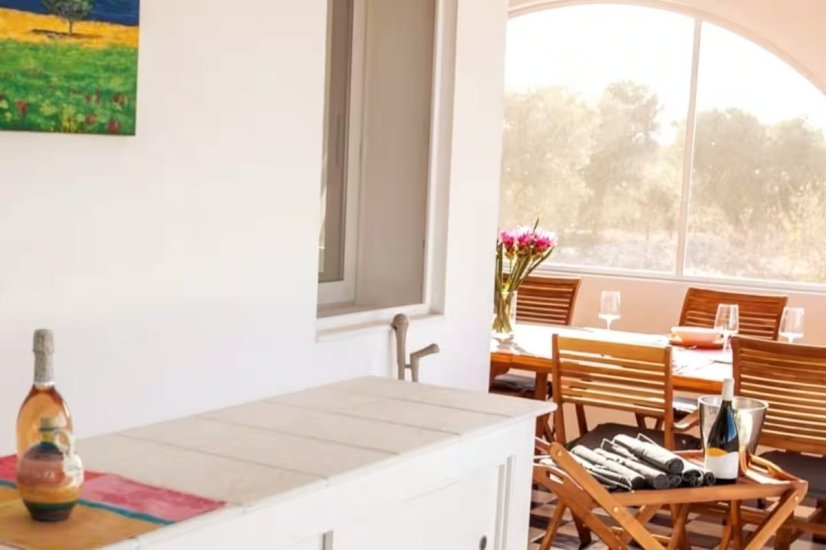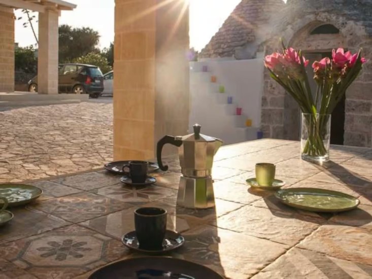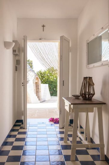 Completamente ristrutturata nel 2023, la proprietà unisce una villa principale e un trullo originale, entrambi riportati a nuova vita con un progetto raffinato che valorizza materiali locali e linee pulite. La luce domina ogni ambiente: pareti e soffitti bianchi amplificano gli spazi, mentre la pietra naturale di Trani utilizzata nei pavimenti del trullo e di due camere da letto dialoga con le cementine e ceramiche italiane originali preservate con cura nelle altre stanze, nei bagni, nella veranda e nella cucina in muratura.