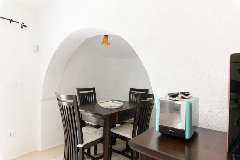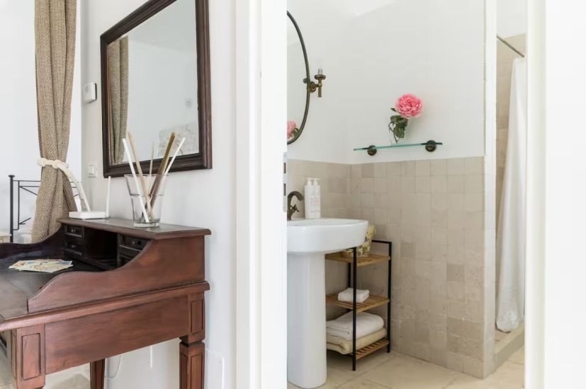 La villa principale, ristrutturata e finemente arredata, accoglie con ambienti ampi, luminosi e armoniosi. L’ingresso introduce in una zona giorno elegante e rilassante, impreziosita da un divano letto doppio, ideale per ospiti o famiglia. La cucina indipendente, completamente attrezzata con forno, tostapane e ogni comfort, si apre su una dimensione conviviale grazie al tavolo da pranzo, perfetto per colazioni lente e cene estive. La zona notte ospita una camera matrimoniale intima e raffinata e un bagno con doccia, dal design funzionale e contemporaneo.