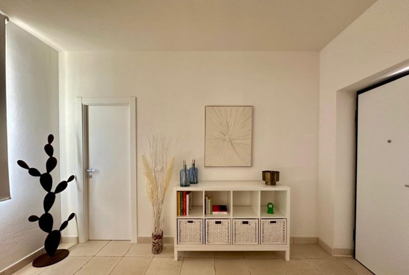 Dal soggiorno, una grande porta finestra conduce alla veranda arredata, un vero salotto all’aperto con tavolo da pranzo, pensato per vivere la casa in continuità con la natura circostante, tra profumi mediterranei e tramonti dorati.