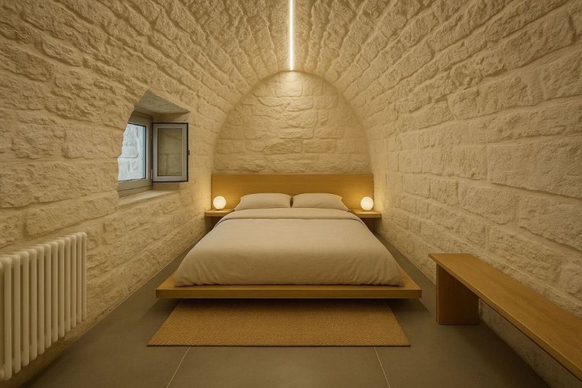 -Gli interni combinano la forza della pietra viva con un design minimalista moderno, arricchito da arredi su misura e impianti tecnologici all’avanguardia.