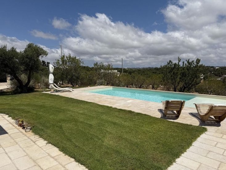Protagonista assoluta degli spazi esterni è la piscina panoramica di circa 40 mq, con sistema cloro/sale, affacciata sul paesaggio rurale della Valle d’Itria. Intorno, prato inglese, area solarium e silenzi interrotti solo dal vento tra gli ulivi: uno scenario da copertina, perfetto per chi cerca bellezza autentica e relax esclusivo.