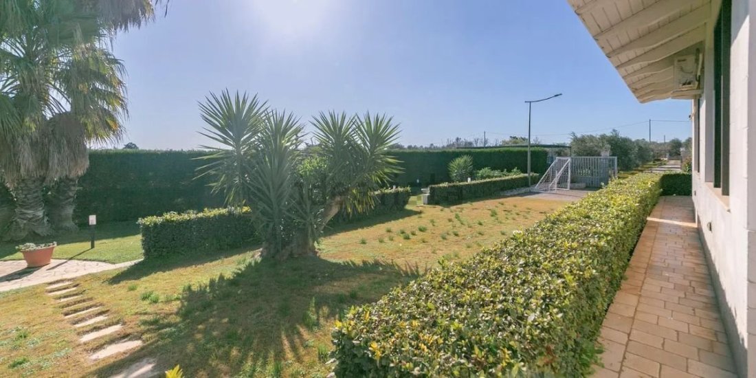 La proprietà si estende su circa 4.000 mq di terreno e vanta un rigoglioso giardino mediterraneo con circa 40 ulivi secolari, aranci, mandarini e limoni, oltre a una suggestiva pineta privata con querce e pini. L’intera area è recintata e protetta da doppio cancello, garantendo sicurezza e riservatezza assoluta.