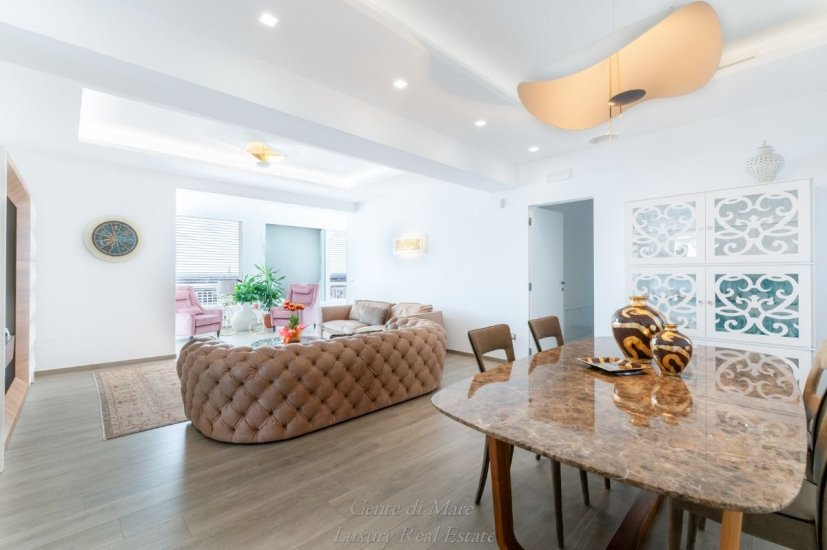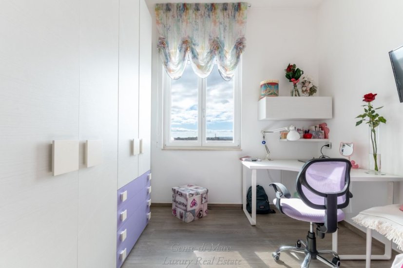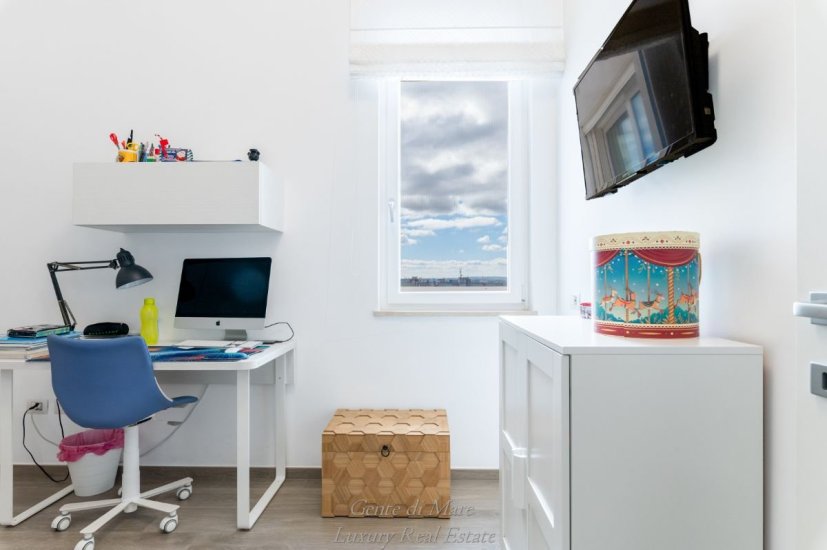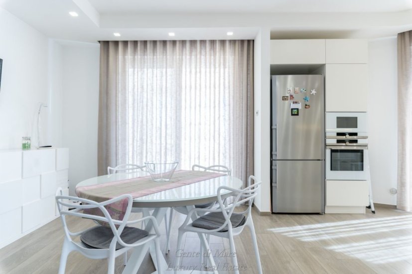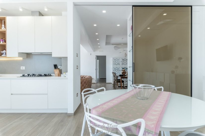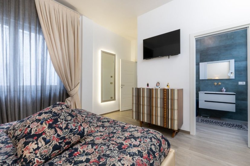 Gli interni si sviluppano su una superficie di circa 180 mq, completamente ripensati con un progetto raffinato e contemporaneo. Il grande soggiorno è il cuore scenografico della casa, con affaccio diretto sull’attico verandato, uno spazio luminoso e riservato, protetto da serrande regolabili, ideale per vivere il panorama in ogni stagione. La cucina ampia e conviviale, anch’essa con affaccio sull’attico, è pensata per chi ama ricevere e vivere la casa con naturalezza.