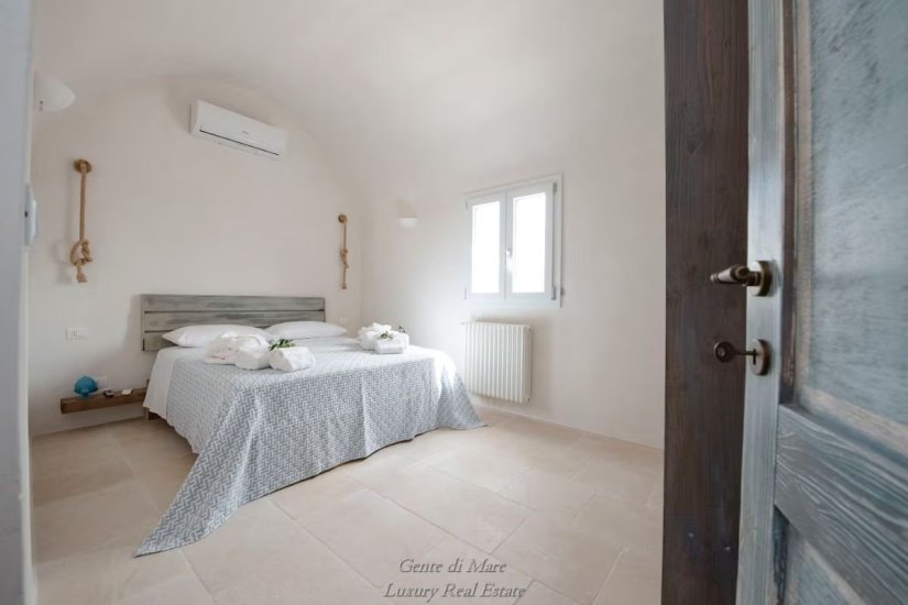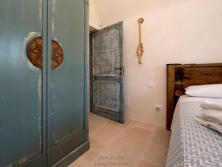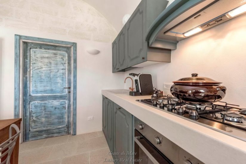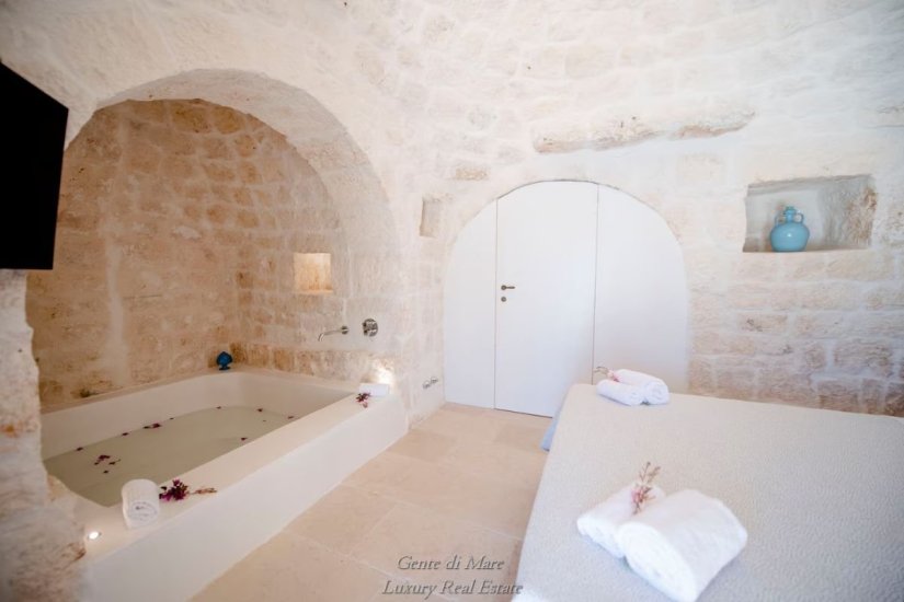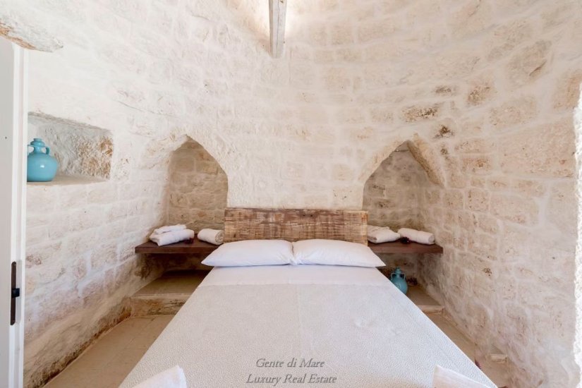 Accanto alla villa si trova un antico trullo di oltre 100 anni, restaurato con cura per preservarne l’autenticità. All’interno conserva dettagli affascinanti della tradizione, come la vasca da bagno in pietra, il portone originale e i caratteristici gradini laterali che un tempo venivano utilizzati per l’essiccazione di fichi e legumi. Gli stessi gradini conducono alla sommità del trullo, da cui si può ammirare una splendida vista panoramica sulla vallata fino al mare. Il trullo ospita una camera matrimoniale con ampia vasca da bagno e bagno privato, creando un ambiente intimo e suggestivo.