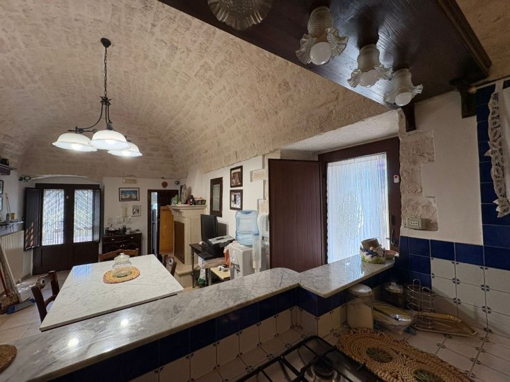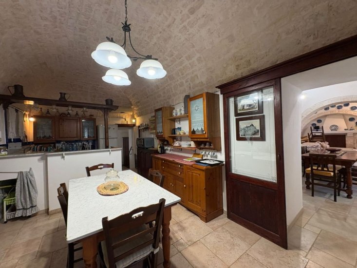 GLI INTERNI: La proprietà si sviluppa su circa 250 mq tra trulli e lamie. Il corpo principale accoglie un ampio open space luminoso, con cucina in muratura e tripla uscita esterna, tre camere da letto e due bagni. Al piano sottostante, sempre con luce naturale, si trovano due bilocali indipendenti, ciascuno con zona giorno/notte, angolo cottura, bagno e spazi esterni privati.