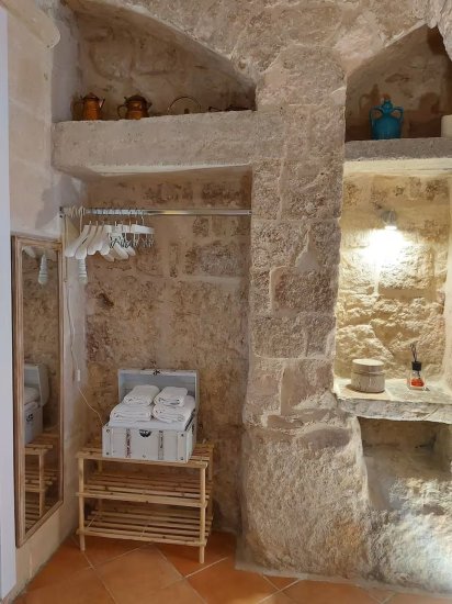 GLI INTERNI: Un unico ambiente accogliente e luminoso dove la pietra a vista è protagonista. La zona living ospita un letto matrimoniale comodissimo, un caratteristico armadio scavato nella roccia, area pranzo con TV e un affascinante camino originale in pietra. La cucina è completa di tutto, inclusi frigorifero e macchina per il caffè. Il bagno, pratico e tipico, dispone di doccia, bidet, wc, lavabo e phon.