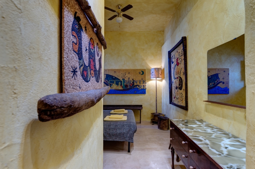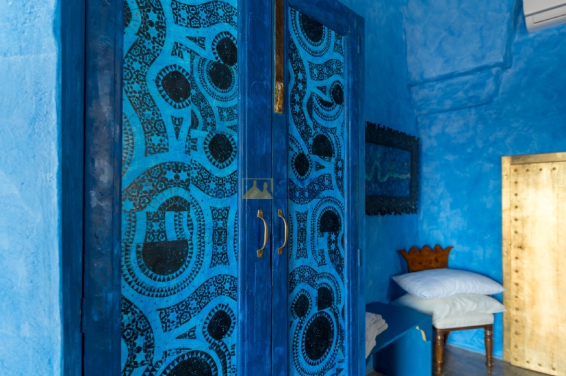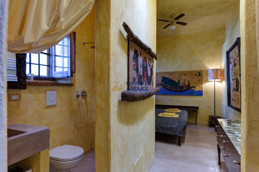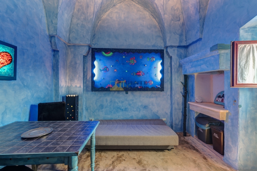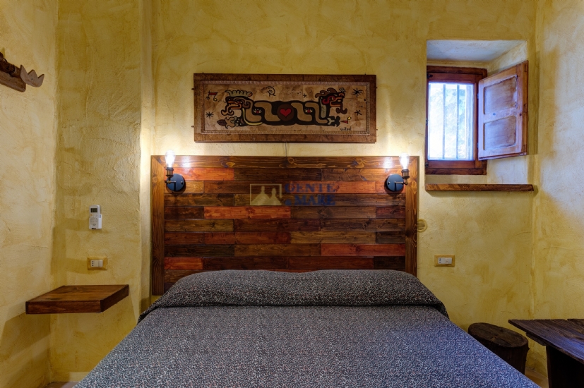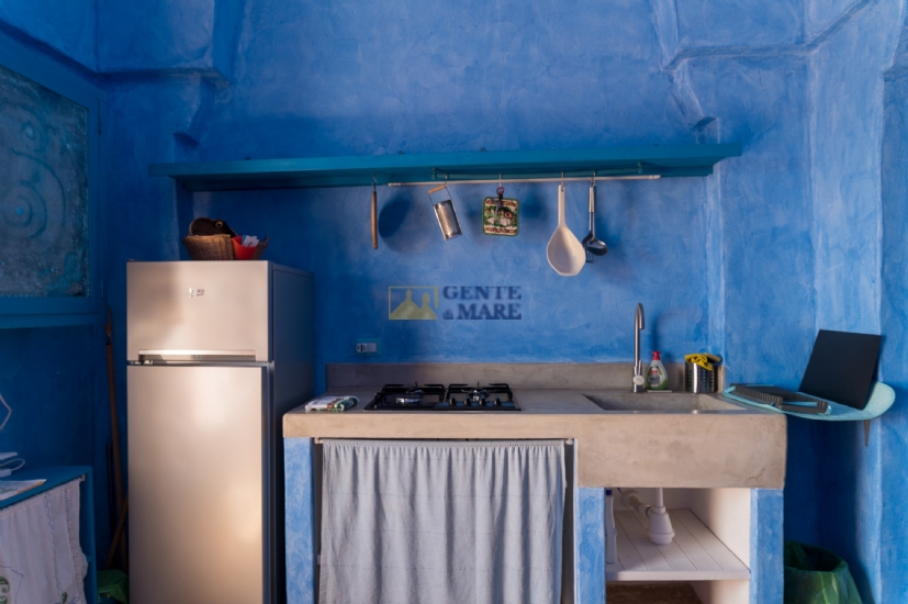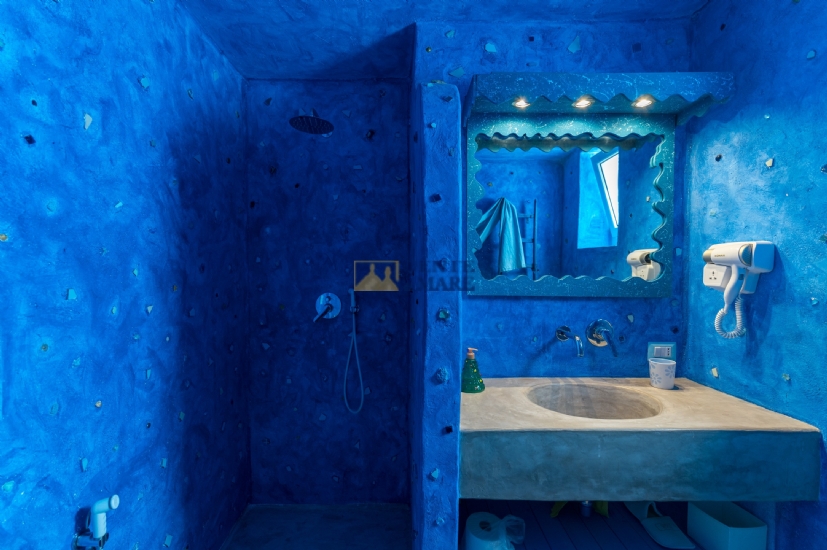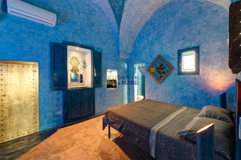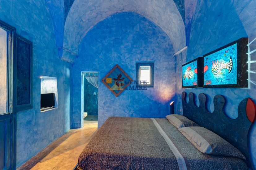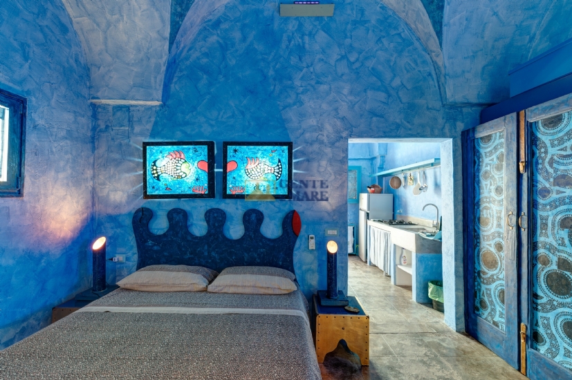 The third flat, on the first floor, is a true dive into the blue, into that magical blue that characterises our crystal-clear sea. It consists of a bedroom, a bathroom and a kitchen with a sofa bed. You will feel like you are living in a beautiful aquarium set among unique works of art, a magical atmosphere that will take you into an almost fairytale dimension.