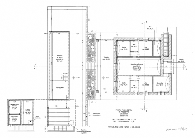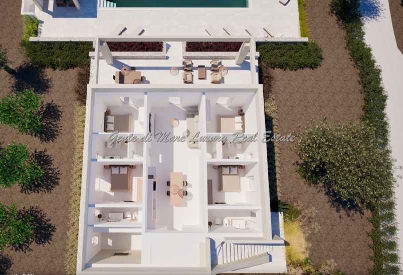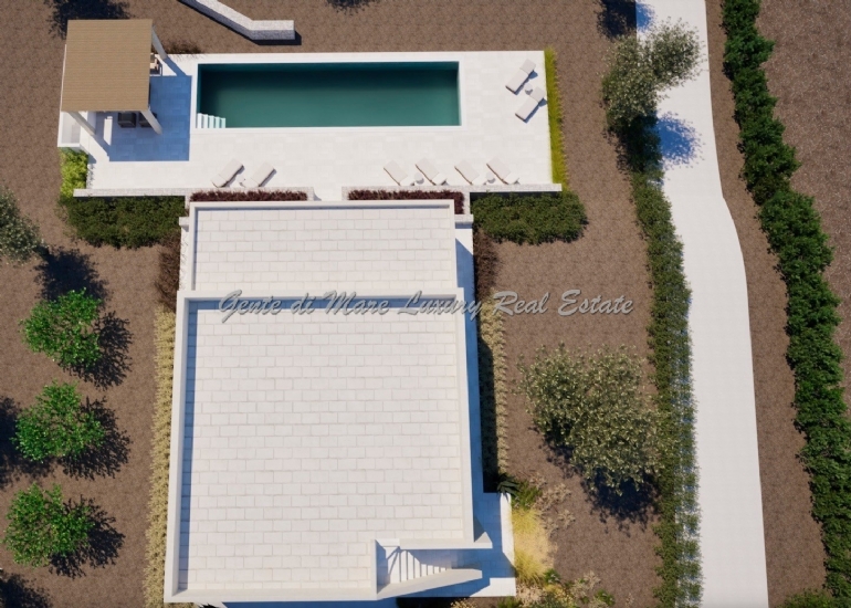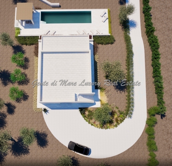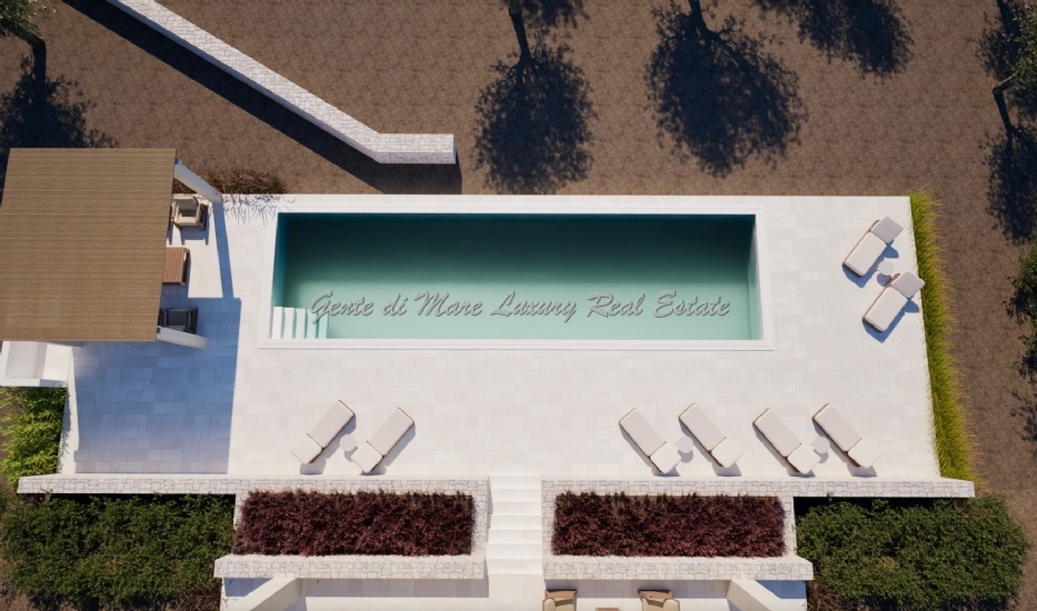 Services and utilities: The villa will be built with double masonry, 40/50 cm high igloos, the house is perfectly insulated with a double layer of thermal insulation. The 60-square metre infinity pool has an internal staircase with bench and two whirlpools, equipped with a salt chlorinator with automatic electronic regulator with metering pump, suction kit. The structure has an underfloor heating system with heat pump, and two inverter heat pumps for cooling. The house is equipped with a photovoltaic system with 3 kw and an alarm system. The villa has an artesian well.