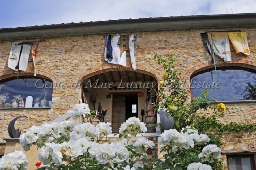 The farmhouse, spread over four levels for a total of approximately 490 sqm, was rebuilt in 2004, respecting the historical roots of the original ruins. The traditional Tuscan stone architecture combines with bright and refined interiors. On the main floor, an elegant atrium with a staircase leads to the living area, where large windows frame the surrounding greenery. The spacious kitchen, equipped with a practical pantry, opens onto a panoramic terrace perfect for outdoor dining.