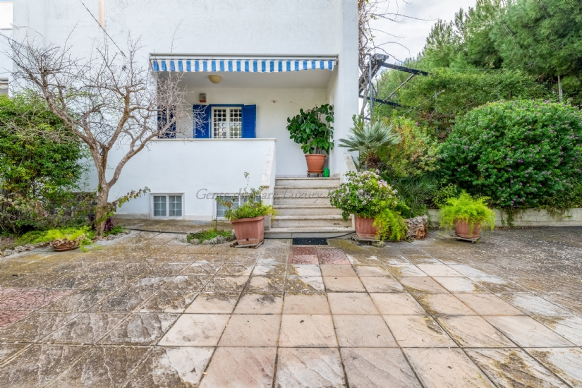 The garden surrounding the villa is a well-kept green space with maritime pines, bougainvillea, olive trees, tropical plants and prickly pears. The outdoor patio and the large covered terrace with sliding awning offer ample space for outdoor dining or relaxing moments. In addition, a brick barbecue is ideal for summer dinners with friends and family. On the upper floor, a terrace overlooking the sea and pine forest offers breathtaking views.