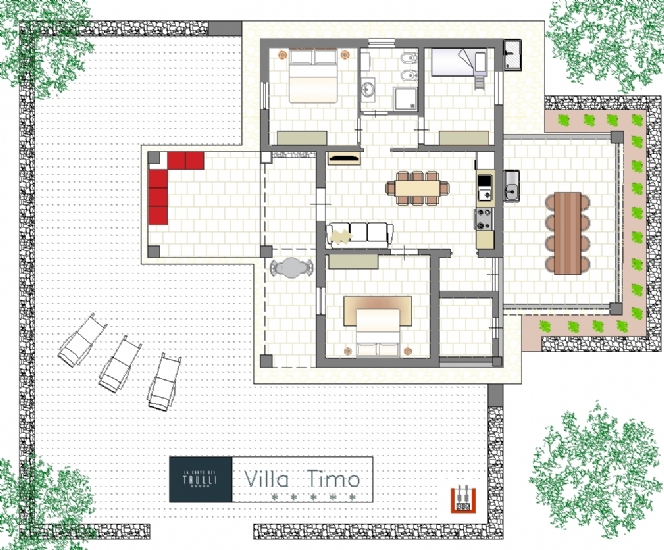 A rendere il tutto ancora più esclusivo, due ampie verande sul retro arredate per godere di cene all’aperto sotto un cielo stellato, magari accompagnati dal suono delle cicale e da un calice di vino Primitivo.