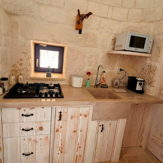 Il trullo, raffinato nella sua essenzialità, conserva intatti i suoi volumi originari: un’alcova con letto matrimoniale, una cucina funzionale e un bagno completo, perfetto per accogliere ospiti in cerca di autenticità o da destinare a uso ricettivo.