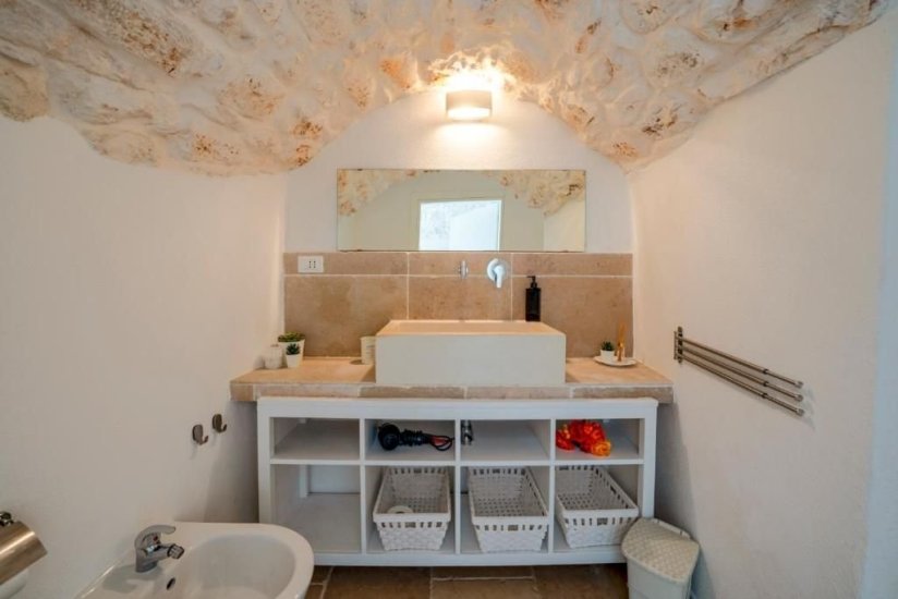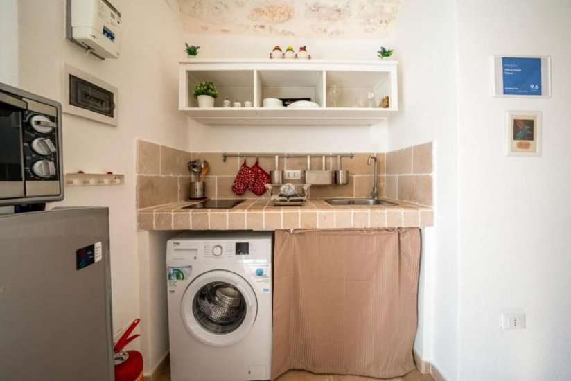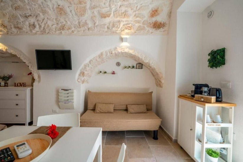 Varcando la soglia, si viene accolti da un’atmosfera calda e raccolta, dove la pietra viva delle pareti racconta storie antiche, mentre le scelte architettoniche moderne regalano comfort e funzionalità. Il monolocale è stato recentemente ristrutturato con eleganza sartoriale, e può ospitare comodamente due persone. Il vero protagonista è il bagno, ampio e luminoso, impreziosito da una doccia walk-in di design che evoca le spa di boutique hotel internazionali. L'angolo cottura, discreto ma perfettamente attrezzato, permette di vivere la casa anche nel quotidiano, con la possibilità di cucinare e accogliere con gusto. A completare la dotazione: Wi-Fi veloce, lavatrice e tutti i comfort essenziali per una vita rilassata e senza pensieri.