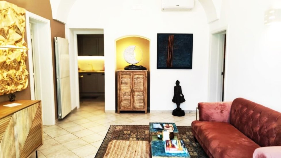 Appena varcata la soglia, si viene accolti in una zona giorno ampia e luminosa, dove la luce del sud-est accarezza le superfici con dolcezza e valorizza la palette di colori neutri e sofisticati. L’atmosfera è calda, curata, perfetta per rilassarsi dopo una giornata tra le bellezze della Valle d’Itria o per ricevere ospiti in un ambiente dal gusto internazionale.