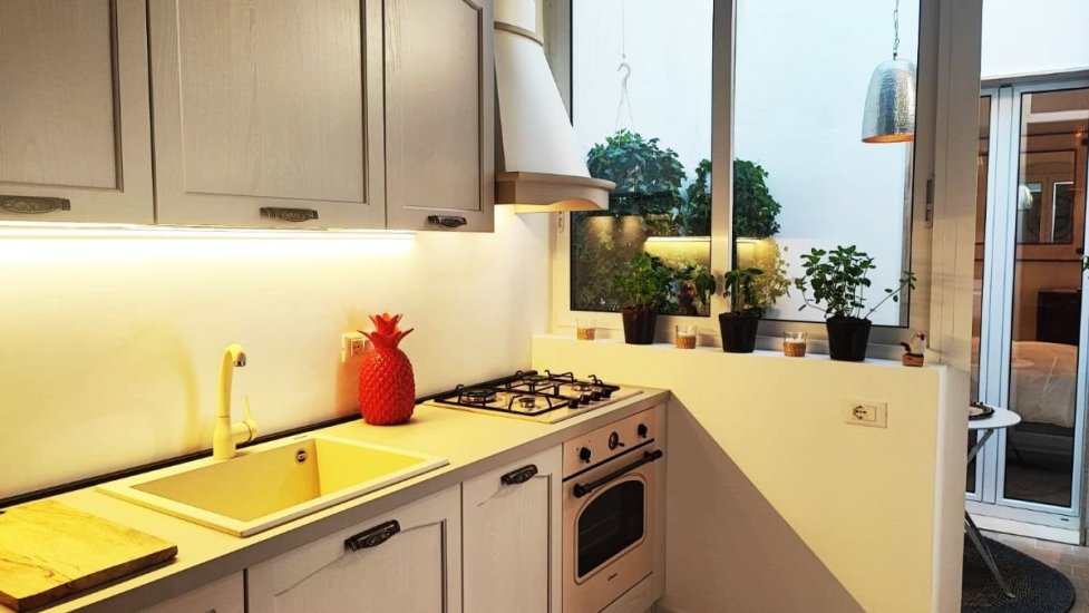 La cucina abitabile, completamente attrezzata e affacciata su uno spazio esterno privato, invita a vivere il ritmo lento della vita pugliese: colazioni all’aperto, cene sotto le stelle, momenti di silenzio e contemplazione tra i profumi delle erbe aromatiche. Un’estensione naturale della casa, ideale per chi ama il connubio tra interno ed esterno.