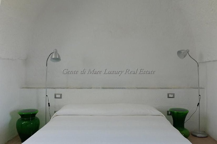 The historic portion retains its original poetry: on the ground floor are the kitchen, dining room and a bathroom, while the time-worn stone staircase leads to the upper level, where two independent units open out. The first, larger one includes four bedrooms and one bathroom; the second, also connected to the courtyard, features a kitchenette, living room, two bedrooms and one bathroom, along with precious access to the panoramic terrace offering open views of the sea and Ostuni. Here you will also find the ancient Palombaia, a rare historical element that adds further value to the property.