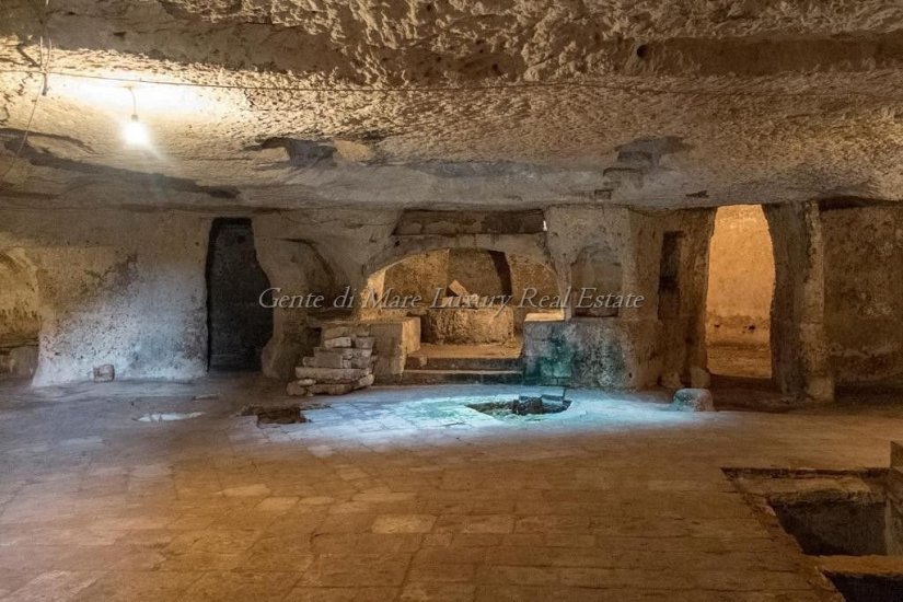 The property unfolds across more than 850 sqm of authentic rural architecture, entirely in tuff and stone, masterfully lime-painted like the celebrated walls of the “White City.” Beneath it, almost like a hidden chamber, lies the hypogeum oil mill of approximately 400 sqm, carved into the tuff subsoil by expanding a natural cave—an atmospheric environment of primordial charm that tells the story of ancient craftsmanship and labor.