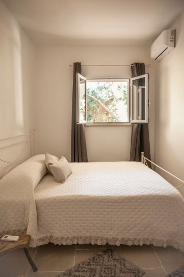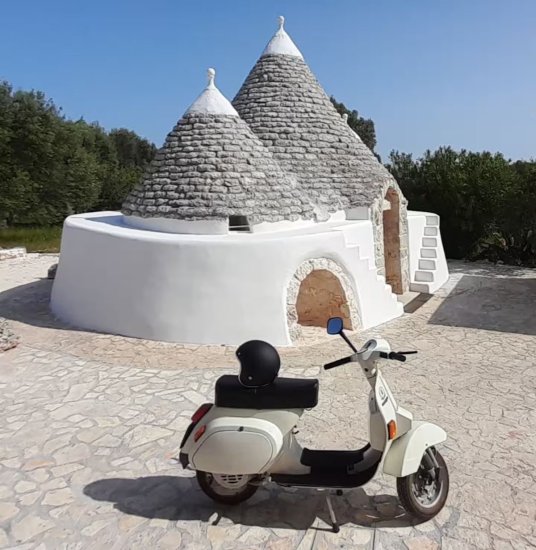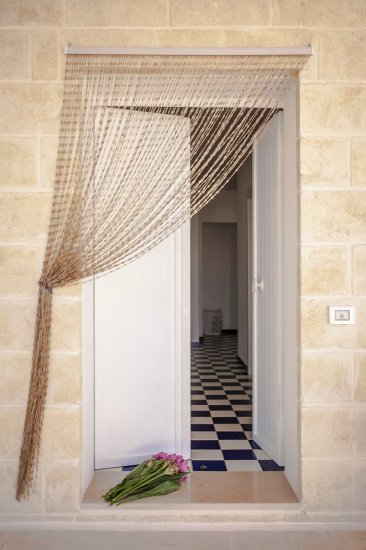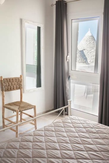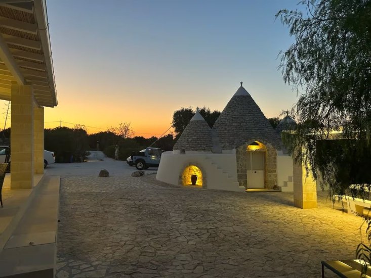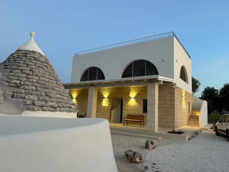 Completely renovated in 2023, the property brings together a main villa and an original trullo, both restored through a refined design that enhances local materials and clean lines. Light defines every space: white walls and ceilings amplify the interiors, while Trani natural stone flooring in the trullo and two bedrooms dialogues elegantly with the original Italian cement tiles and ceramics, carefully preserved in the remaining rooms, bathrooms, veranda, and the built-in masonry kitchen.