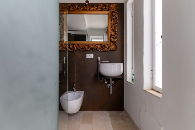 The residence is on the first floor of a charming palace and has been finely renovated with high-quality materials, preserving the historical soul of the building while reinterpreting it in a contemporary style. The entrance opens onto a bright and welcoming living area, designed for relaxation and socializing, which connects to a fully equipped and elegant kitchen. The floor is completed by a refined bathroom.