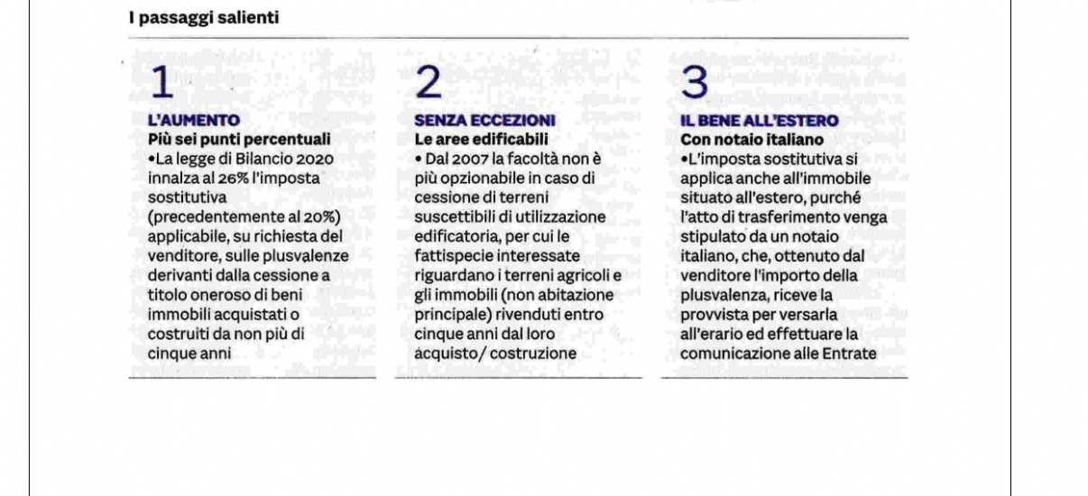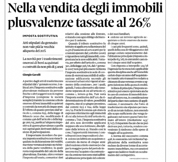 • oppure può chiedere in sede di rogito di applicare un’imposta sostitutiva sulle plusvalenze del 26%, che va pagata al notaio contestualmente al rogito.
