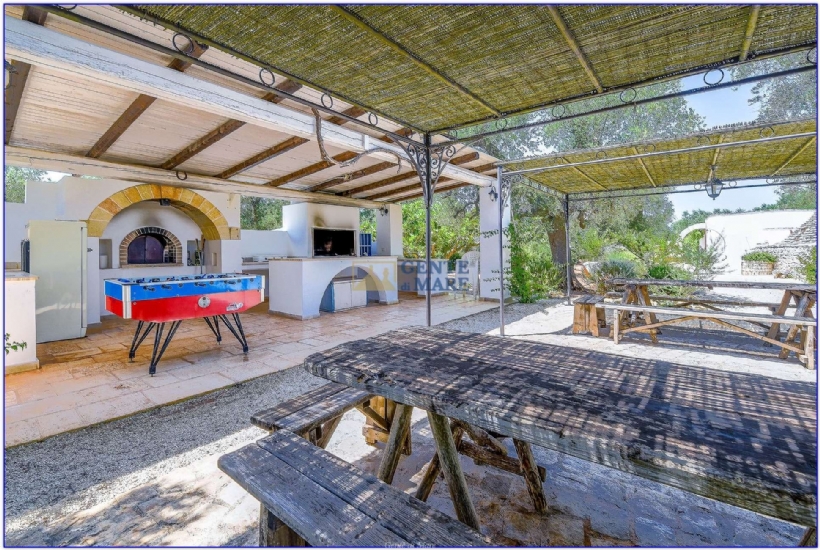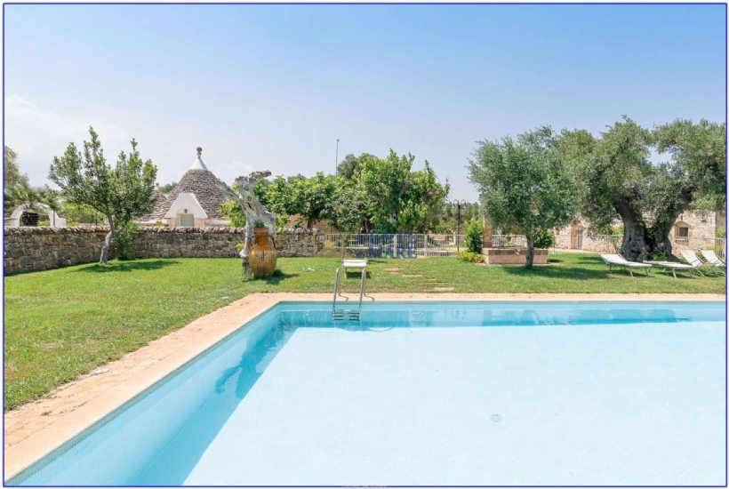 All'esterno è possibile trascorrere piacevoli momenti di relax nella corte che si estende immediatamente all'esterno del trullo, nell'aia, nell'area barbecue o a bordo piscina. La dimora sorge al centro di un terreno che si estende per oltre 24.000 metri quadrati, dominato ulivi secolari, mandorli e svariati alberi da frutto. La seducente piscina al cloro rivestita in piastrelle a mosaico con tre livelli di altezza, è circondata da un’ampia corte con muri in pietra e piante ornamentali. Vi sono, inoltre, due zone solarium perfettamente attrezzate dove trovare il proprio angolo di paradiso.