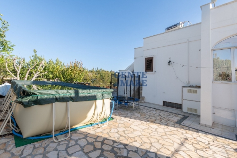 GLI ESTERNI: l’ambiente esterno a Villa Olimpo è un luogo magico dove riscoprire i piaceri della vita di campagna, dove lasciarsi sorprendere e stupire dalle piccole cose. Completamente immersa in un terreno di circa un ettaro recintato e contornato da verdi ulivi e piante da frutto, Villa Olimpo diventerà il luogo ideale dove vivere in completo relax pur essendo a pochi minuti dalla bella Ostuni. Potrai godere di numerosi momenti di convivialità con gli affetti più cari, grazie ad un’ampia veranda chiusa e alla magnifica piscina fuori terra di 7mx3 professionale e rivestibile.