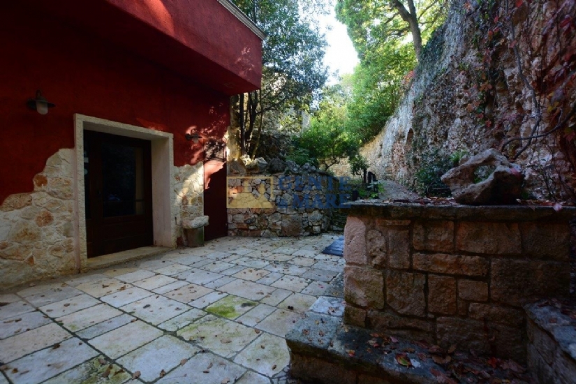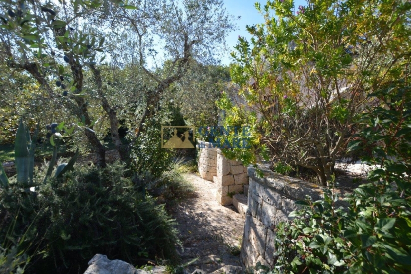 Un camminamento porta sul retro dei trulli e scende al piano seminterrato. Qui la struttura affascina con la sua pietra a vista conducendo in un ampio soggiorno finestrato e illuminato, dotato di servizi e camino vivo nell'alcova per una superficie totale di 106 mq.