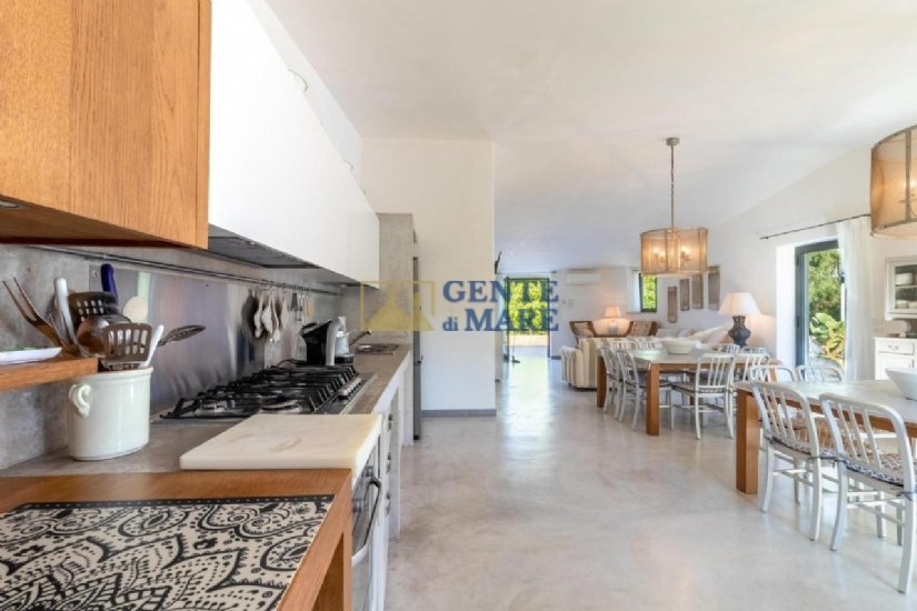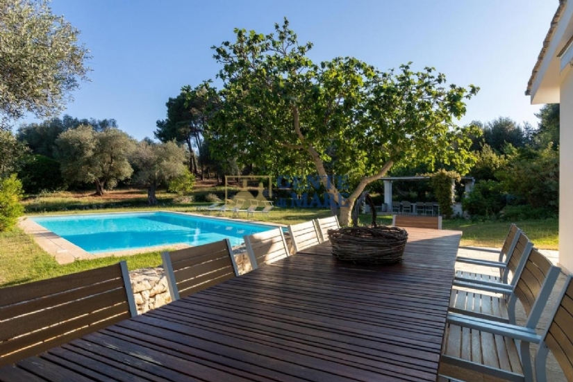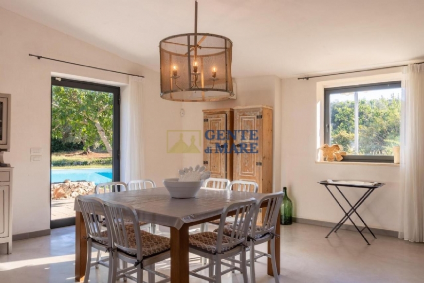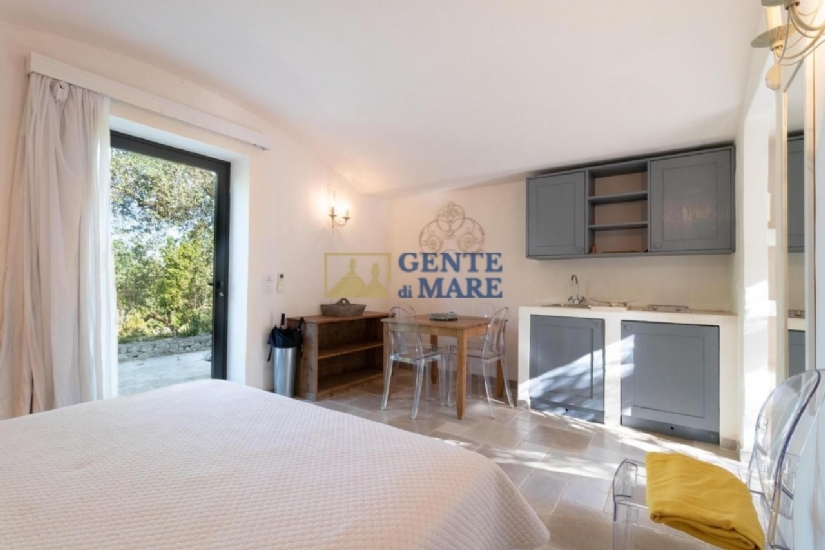 Una vera meta nella meta, che può ospitare fino a 18 persone garantendo privacy. L’armonia estetica degli interni è un valore essenziale, che valorizza la pietra locale. Lo spazio è organizzato attorno alla zona living, con belle vetrate che incorniciano il giardino e la piscina.