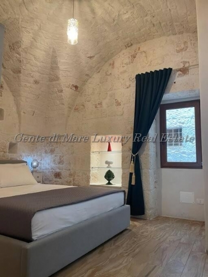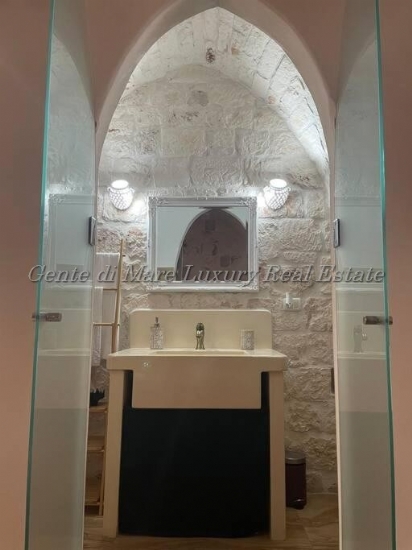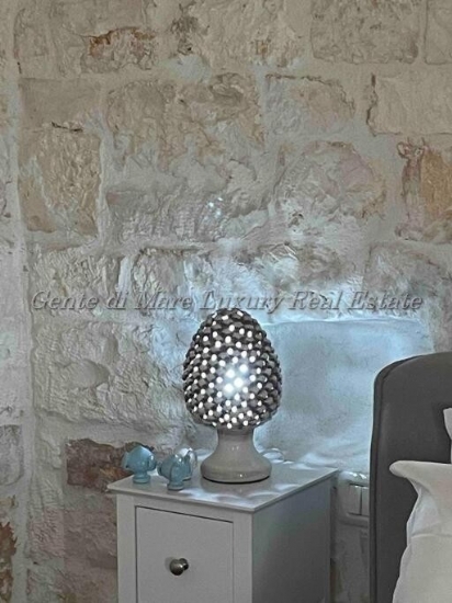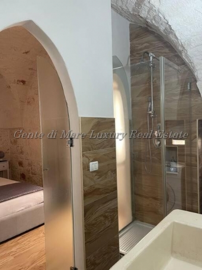 La zona notte è un rifugio romantico, con una spaziosa camera matrimoniale dotata di bagno "en-suite" completo di doppi sanitari e cabina doccia. Ogni ambiente è reso luminoso dalla presenza di finestre, che ottimizzano il ricircolo d'aria e la luce naturale, esaltando la bellezza autentica dei dettagli in pietra.