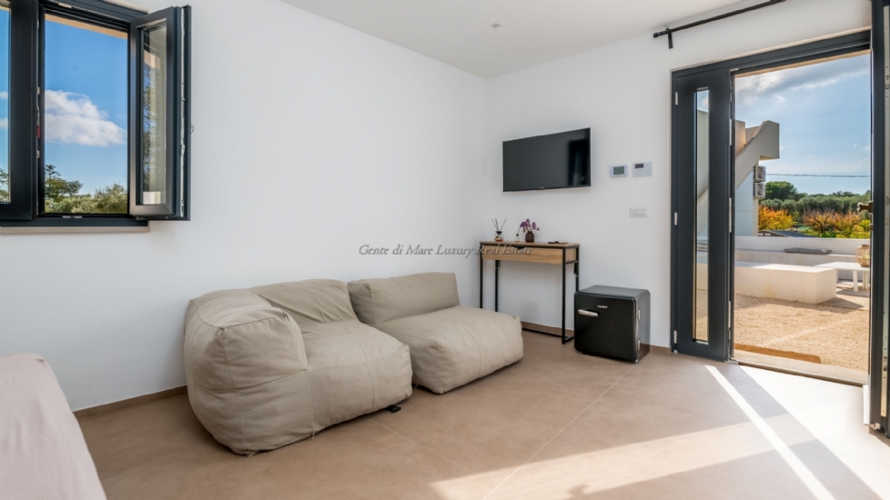 Ad accogliervi un terreno di 3.500 m², dove la serenità della campagna fa da sfondo a una piscina privata incorniciata da un suggestivo muretto a secco, ideale per momenti di relax sotto il caldo sole pugliese. Un solarium panoramico, con comodi gazebo ombreggiati, offre il luogo perfetto per godere di una vista mozzafiato sulla campagna circostante, mentre il giardino con barbecue vi invita a vivere all'aperto con stile e comfort.
