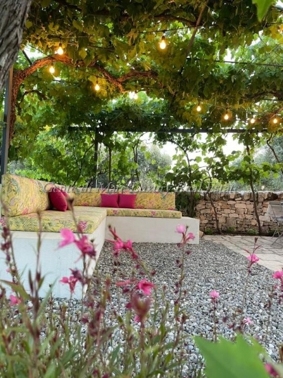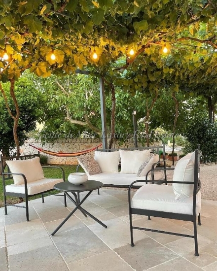 Ma è all’esterno che Trullo Bianco di Puglia svela la sua anima più spettacolare. Immerso in un giardino recintato da muretti a secco, tra profumi mediterranei e ulivi secolari, il cuore pulsante della proprietà è la sua piscina privata di acqua salata: un’oasi d’acqua perfetta per le lente giornate d’estate. Pergolati in legno, zone relax all’ombra, angoli lettura e aree per cene al tramonto compongono un quadro da cartolina che si vive, ogni giorno, dal vero.
