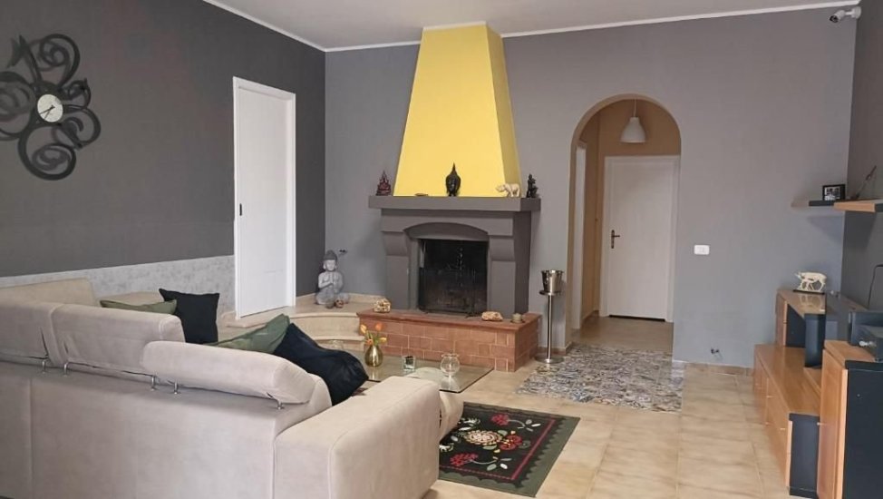 All’interno, il cuore della villa è un ampio soggiorno, dove la luce naturale filtra generosa dalle finestre e accende la pietra chiara delle pareti. Un maestoso caminetto in muratura domina la zona living, creando un’atmosfera calda e accogliente nelle stagioni più fresche. La cucina, ampia e funzionale, si apre verso l’esterno, invitando a colazioni lente e pranzi sotto il pergolato. La zona notte è composta da tre camere da letto luminose, perfettamente distribuite, e un bagno elegante, rifinito con materiali naturali e dettagli artigianali.