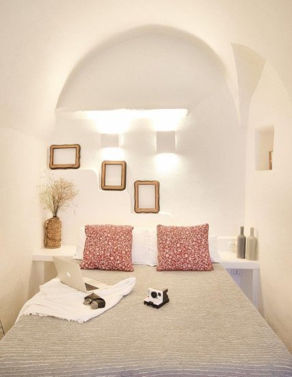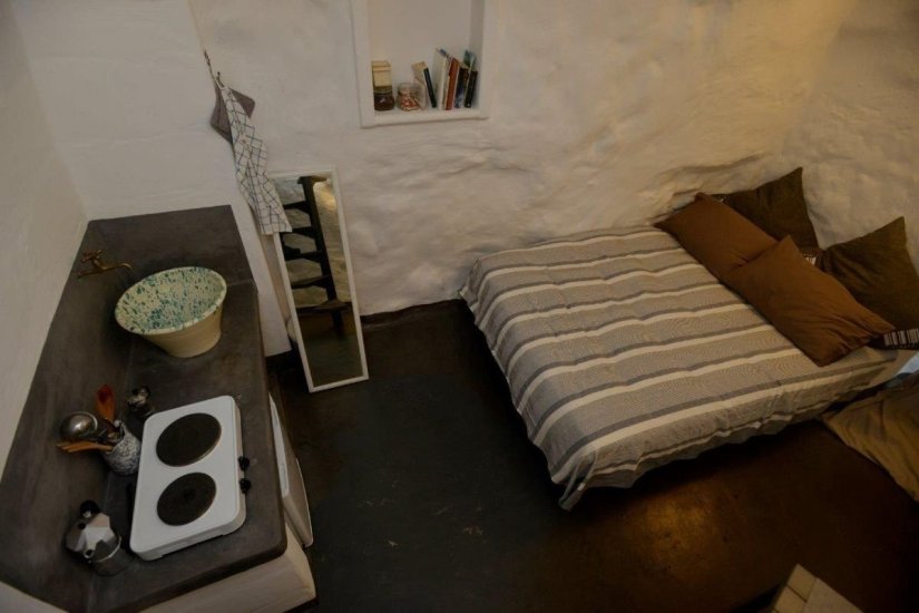 La terza dimora è un vero nido sospeso nella luce di Ostuni. Si raggiunge salendo una rampa di scale che conduce in uno spazio poetico, rivestito di calce bianca, con volte a botte e una finestra che incornicia il cielo come un dipinto d’autore. Un letto alla francese in muratura, angolo cottura con minifrigo, bagno con doccia a vista e libreria: ogni elemento è pensato per creare armonia tra tradizione e intimità.