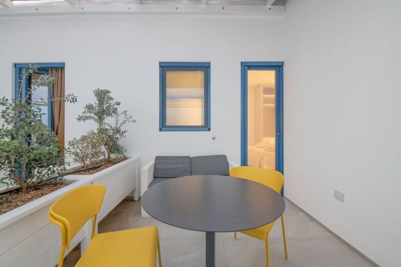 A rendere la proprietà ancora più speciale è la terrazza privata esterna, un angolo di quiete arredato con tavolino, sedie e un piccolo divano, perfetto per colazioni lente, letture al tramonto o un calice di vino sotto le stelle.