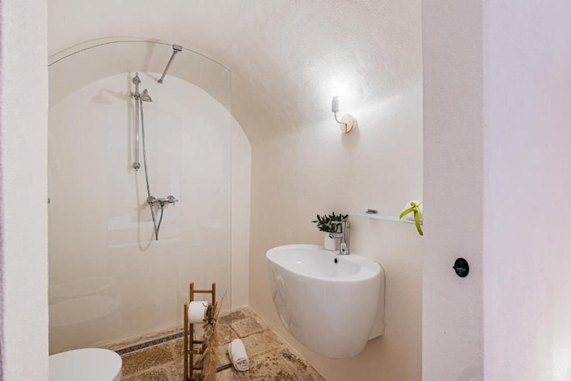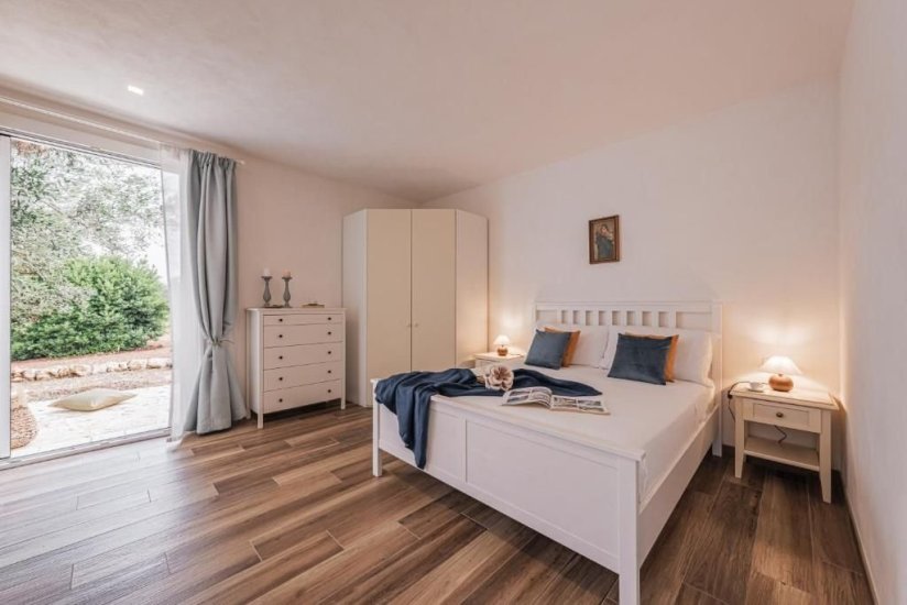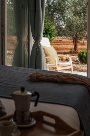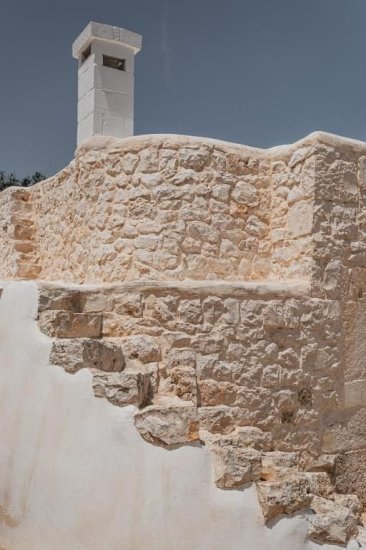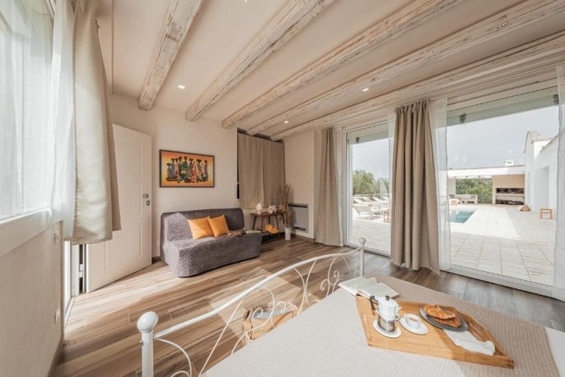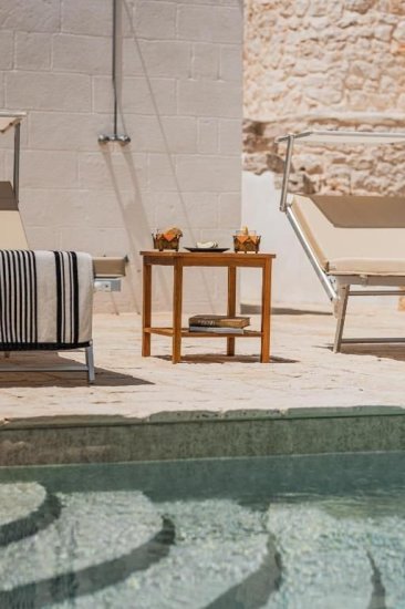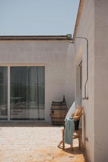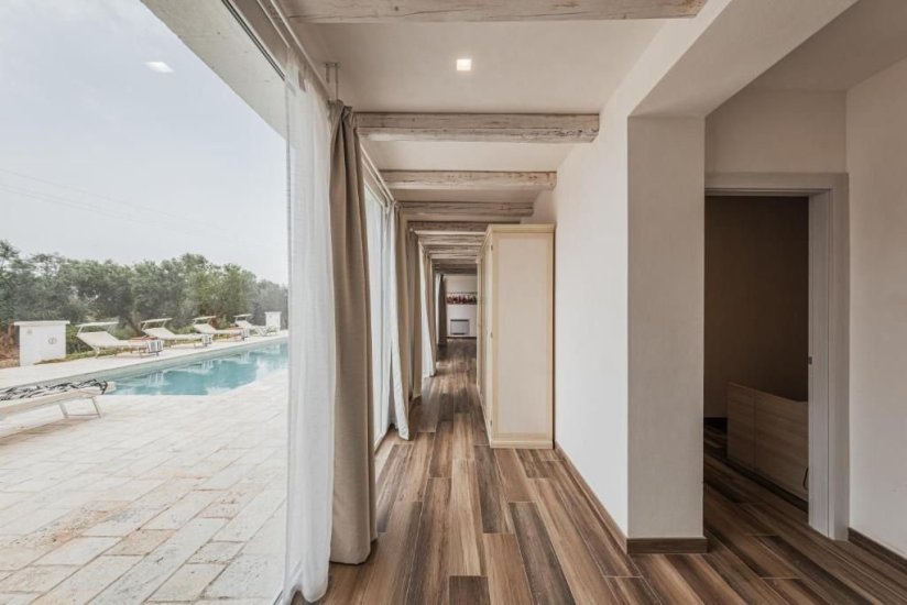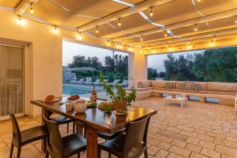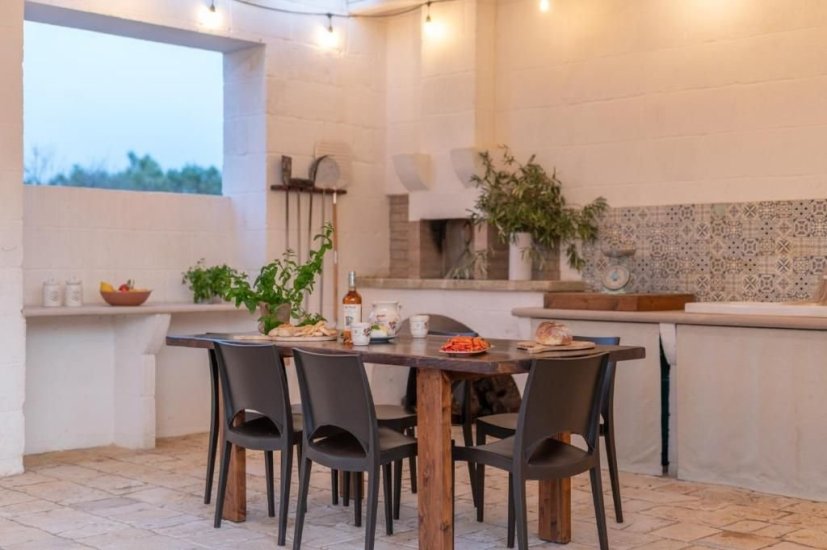All’esterno, un microcosmo mediterraneo prende forma tra alberi da frutto, un curato limoneto, un piccolo orto biologico e gli iconici muretti a secco che custodiscono l’intera tenuta. La piscina, con il suo solarium in pietra chiara, è un invito costante a contemplare il paesaggio e la sua quiete. Un grande patio coperto si apre sulla campagna e diventa un perfetto palcoscenico per pranzi ombreggiati o cene illuminate dall’oro del tramonto. La cucina esterna, completa di forno a legna, barbecue e piano cottura, trasforma ogni serata in un’esperienza gastronomica autentica, degna della migliore tradizione pugliese.