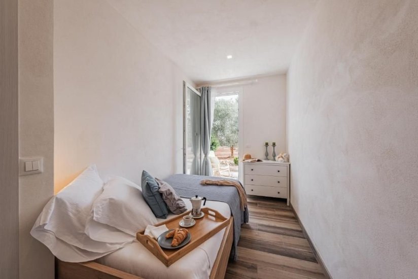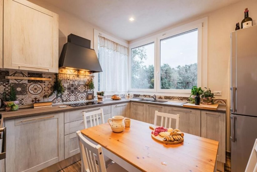 La villa si sviluppa con naturalezza all’interno di un paesaggio privato dove la luce è protagonista. L’abitazione principale ospita quattro camere da letto e tre bagni, una cucina attrezzata pensata per chi ama vivere la convivialità e un luminoso soggiorno con camino che comunica con una sala da pranzo immersa nelle trasparenze del giardino. Gli spazi scorrono fluidi verso l’esterno, dove la grande vetrata invita a raggiungere la scenografica piscina privata (10x4 m, profondità 1,5 m), epicentro del relax estivo. Accanto alla struttura principale, una raffinata dependance in pietra accoglie una quinta camera matrimoniale con bagno privato, perfetta per chi desidera discrezione e indipendenza. In totale, la residenza offre 5 camere e 4 bagni, rendendola ideale sia come dimora privata sia come struttura ricettiva di charme.