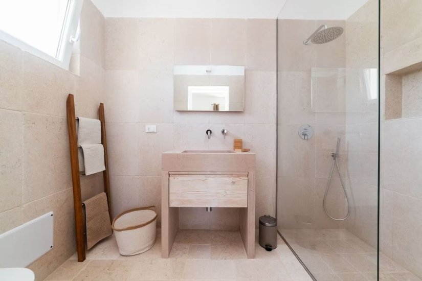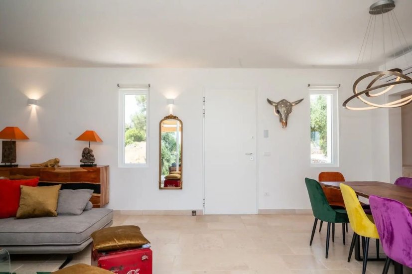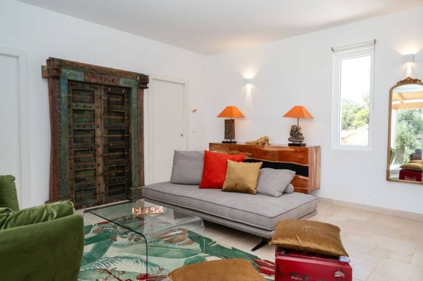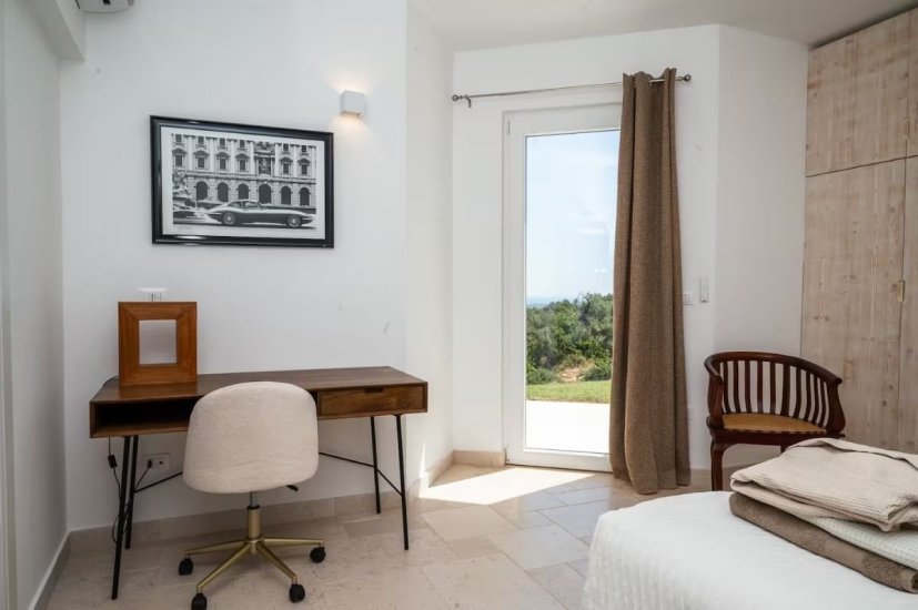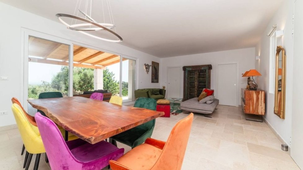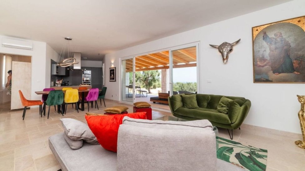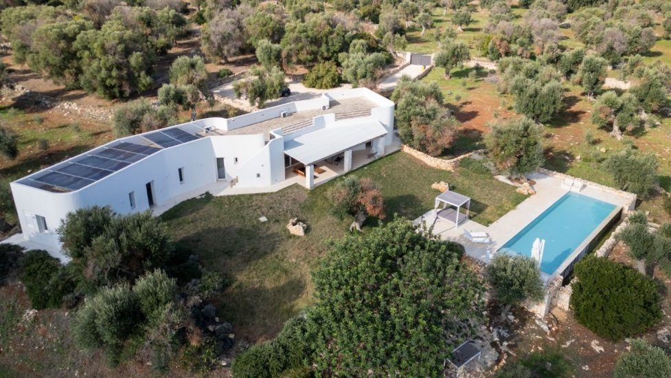 L’architettura moderna, essenziale e perfettamente integrata nel paesaggio, abbraccia un living ampio e luminoso che si apre verso la campagna e il mare, con cucina di design e spazi concepiti per accogliere e sorprendere. La zona notte ospita quattro raffinate camere da letto, ognuna dotata del proprio bagno en suite, per un totale di quattro bagni, garantendo privacy e armonia anche agli ospiti più esigenti. Ogni ambiente è avvolto da materiali naturali, grandi aperture vetrate e dettagli studiati per esaltare la luce mediterranea.